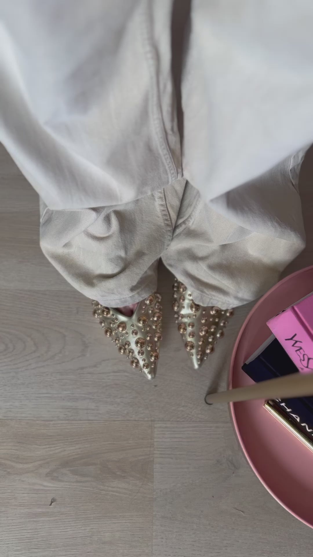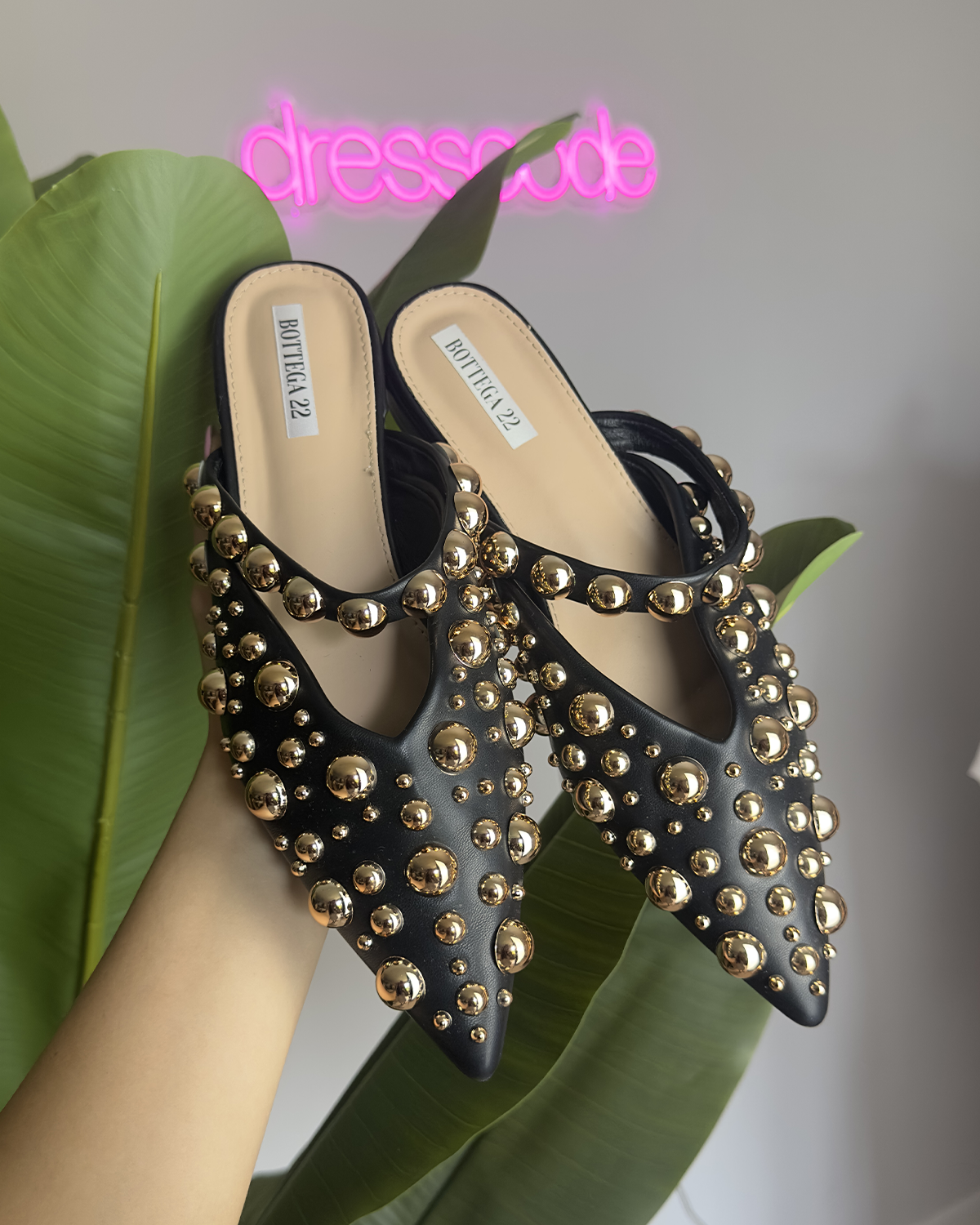 Ballerine sabot a punta in pelle, impreziosite con applicazioni di borchie dorate di diverse misure, con fascia sul collo del piede anch’essa ricoperta di borchie di diverse misure.