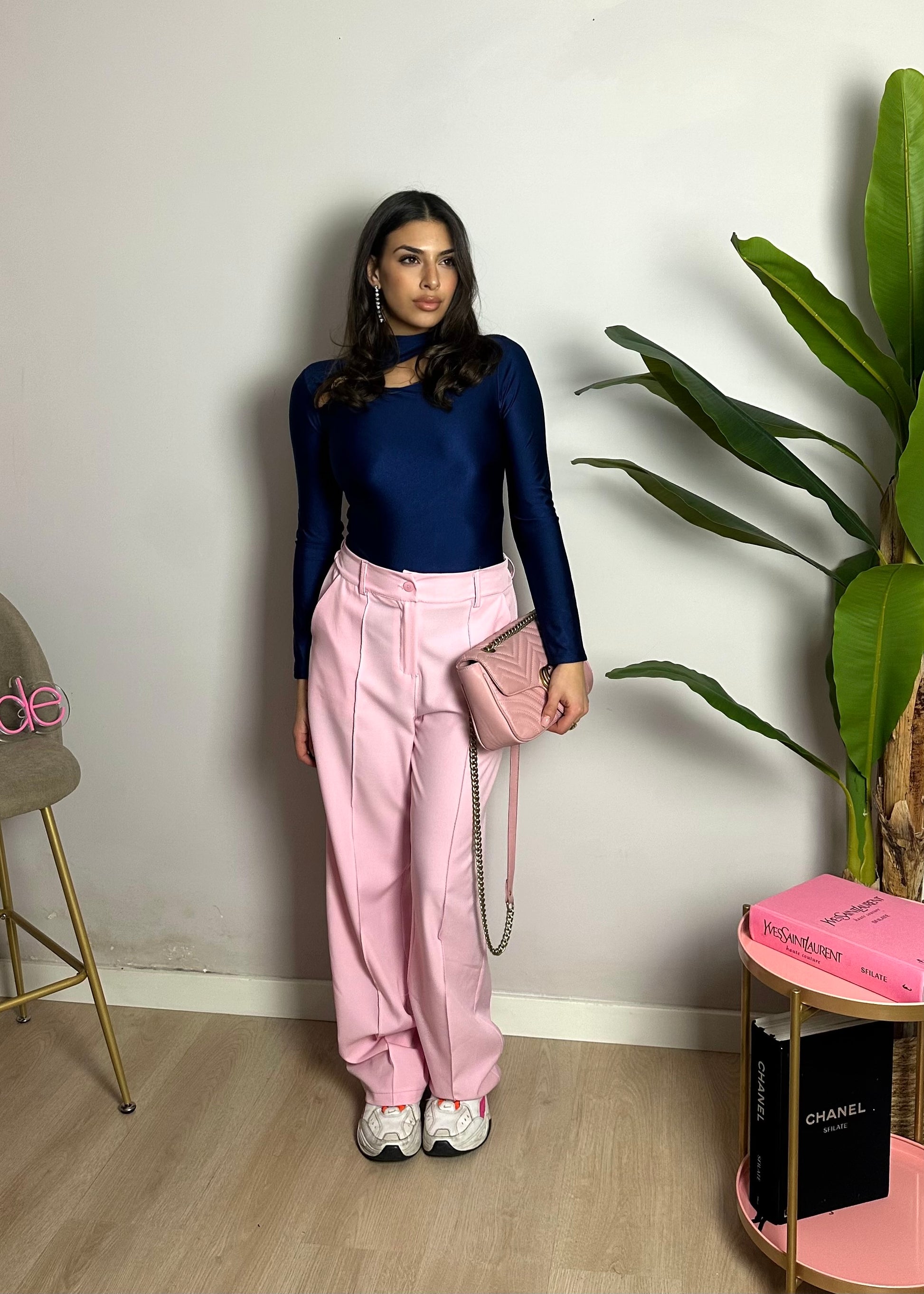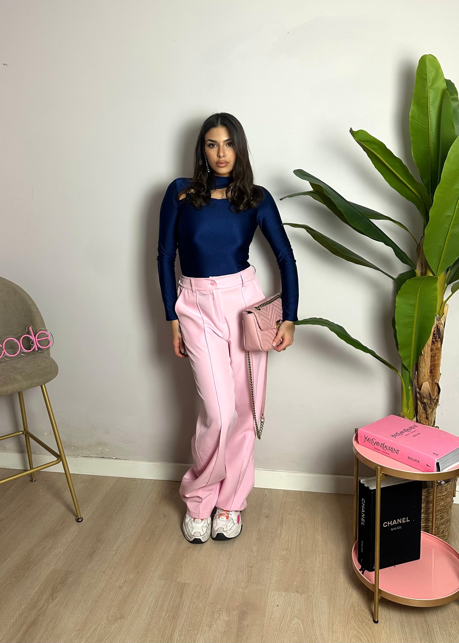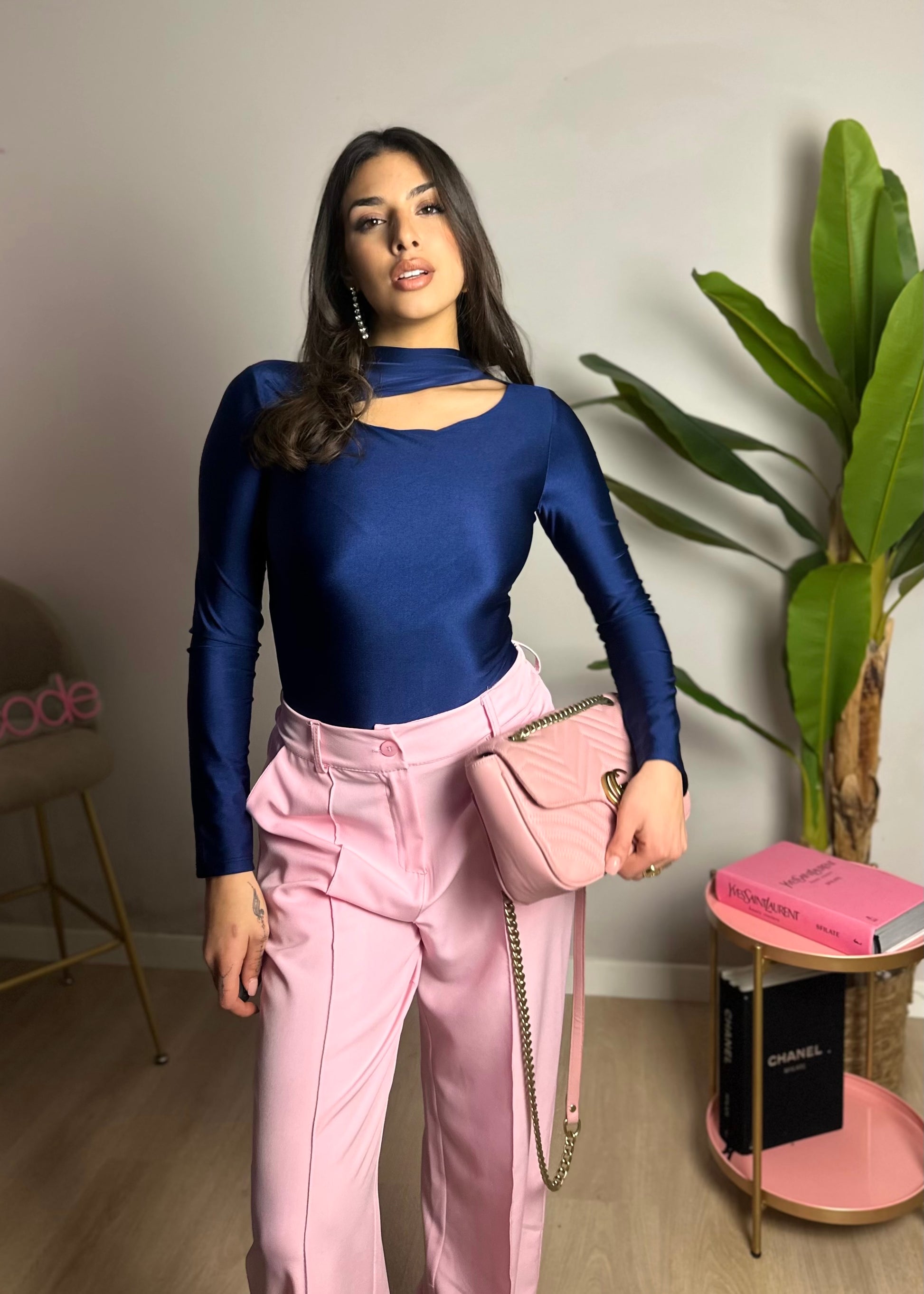 Il body presenta un cut-out asimmetrico sul petto chiuso da un nodo metallico.
