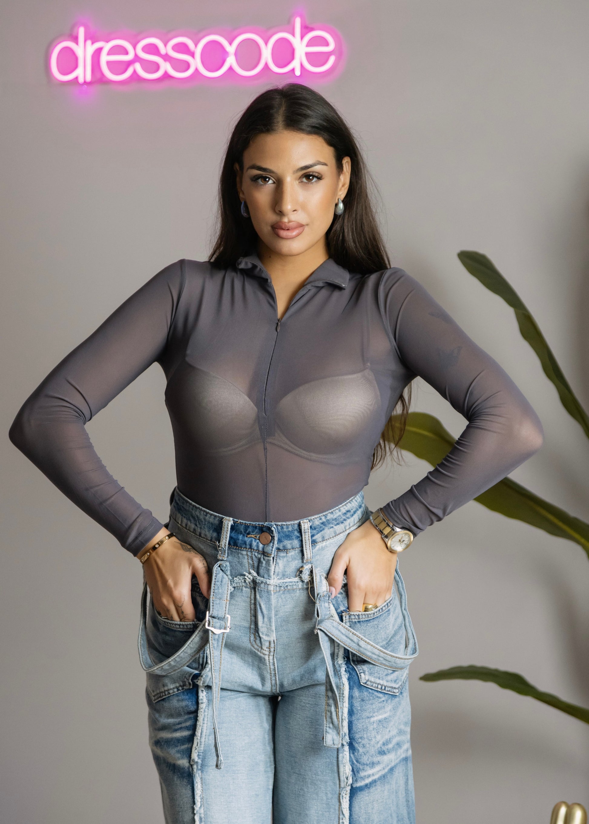 Il body presenta una zip che inizia al centro del collo e finisce sotto il seno.