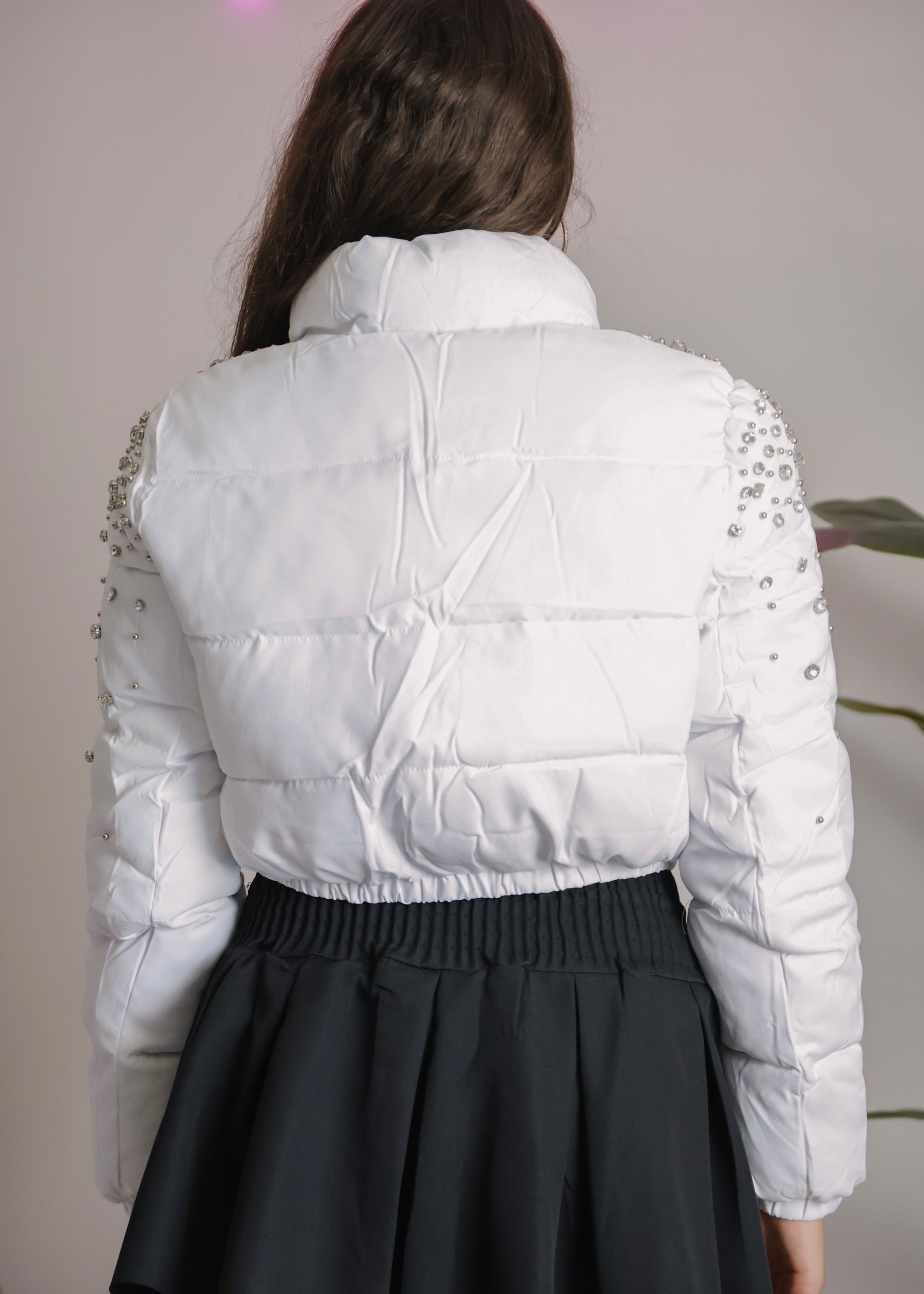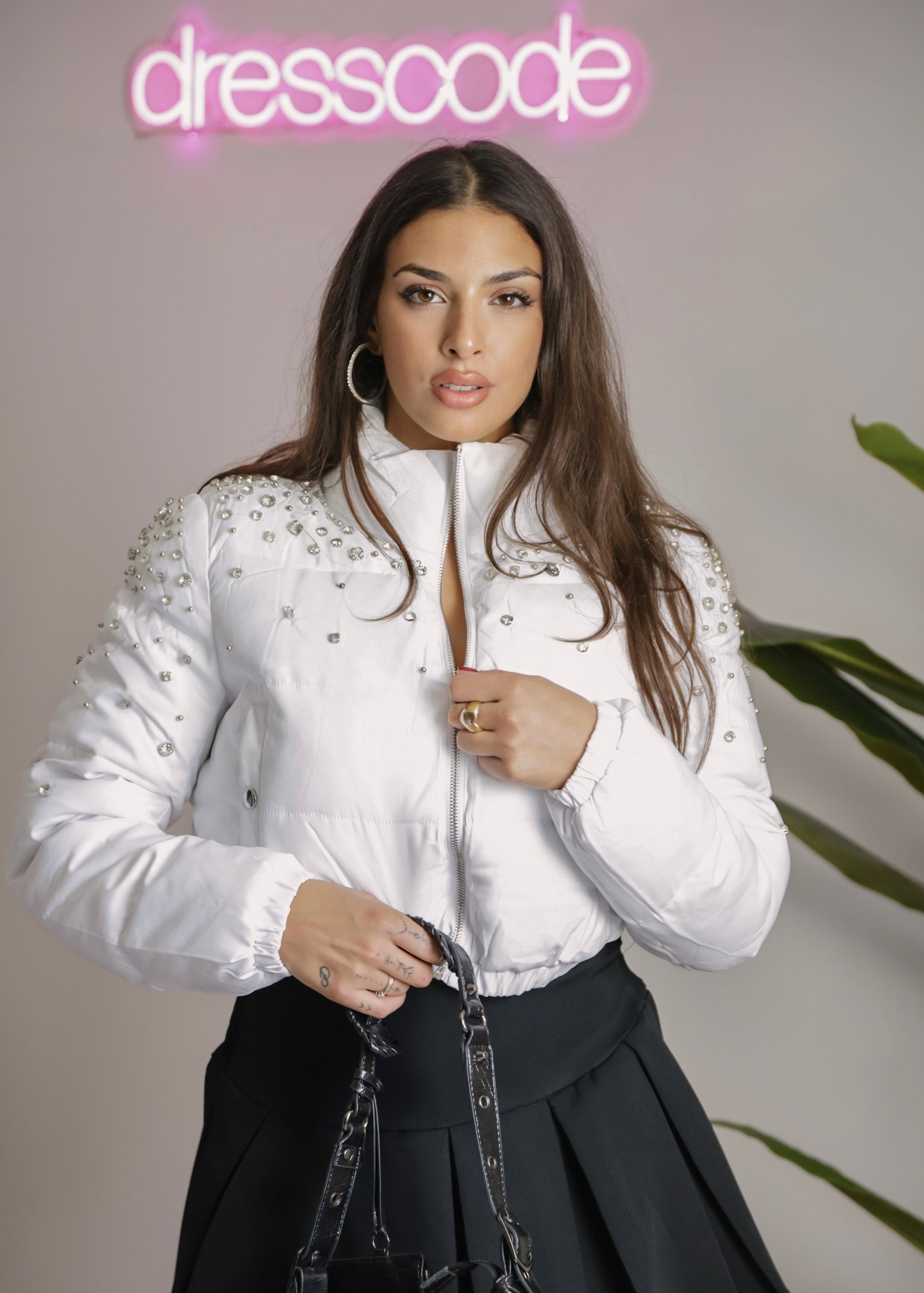 Il bomber è caratterizzato dalla presenza di Swarovski su tutto il tessuto.