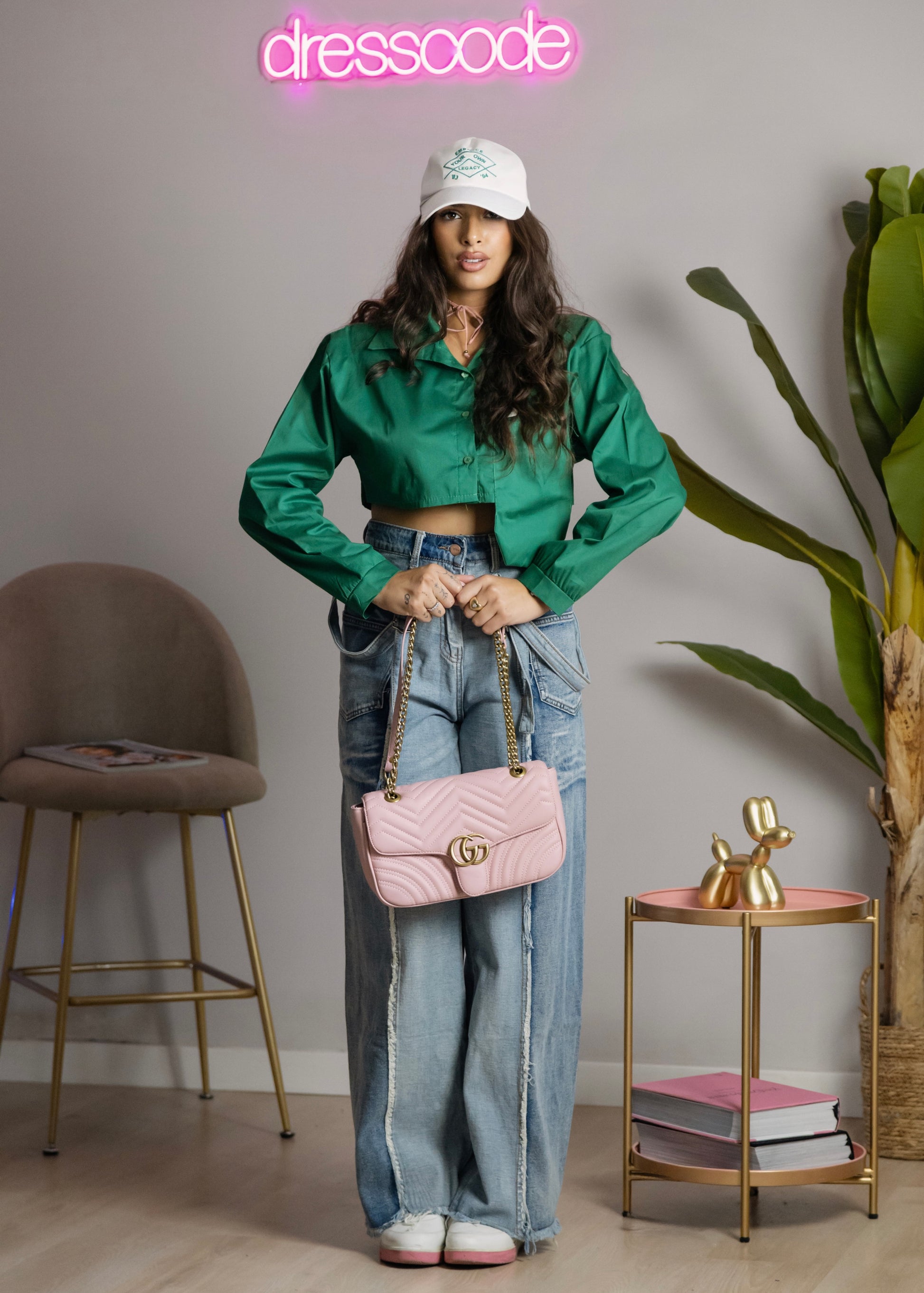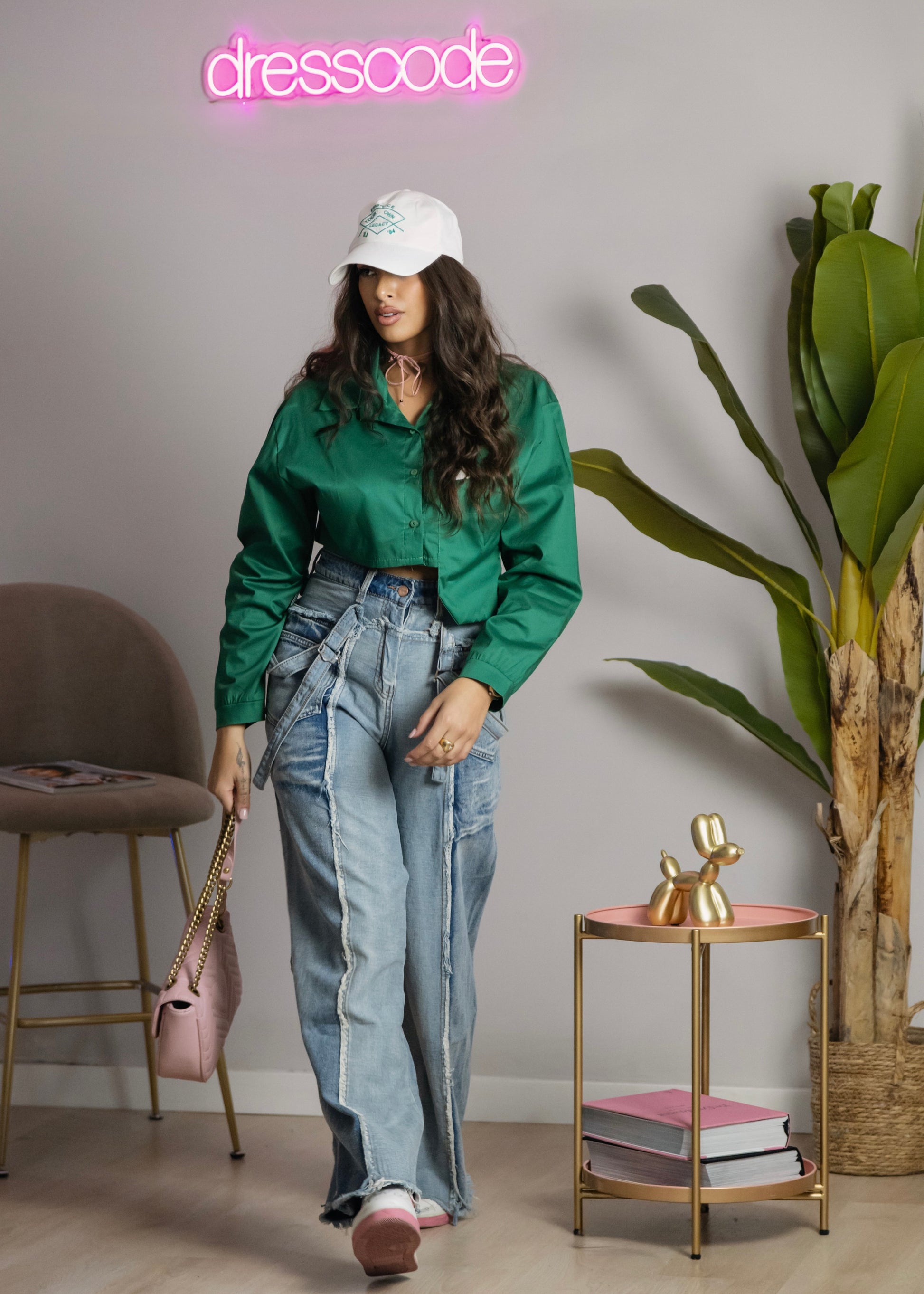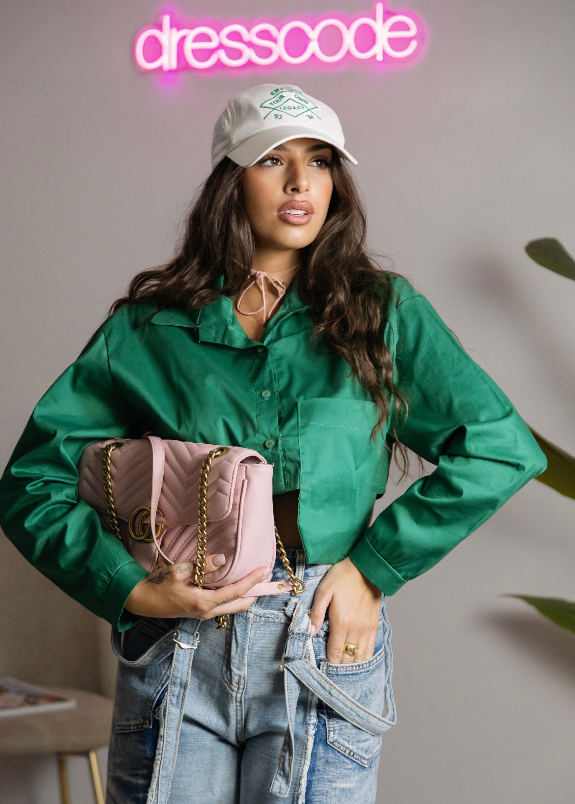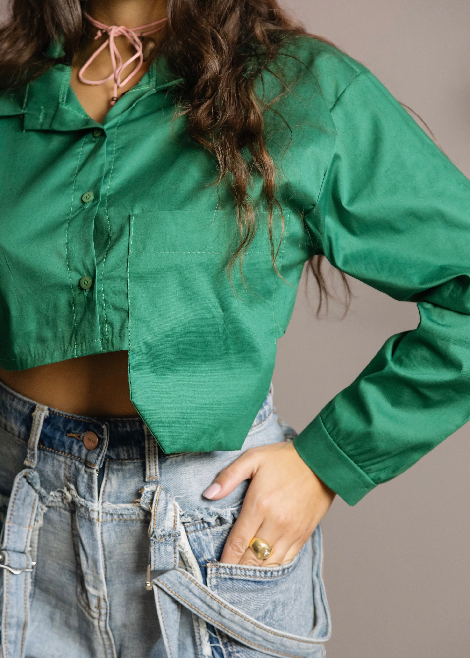 La camicia è caratterizzata dalla presenza di un tascone sul lato sinistroide fuoriesce dalla camicia.