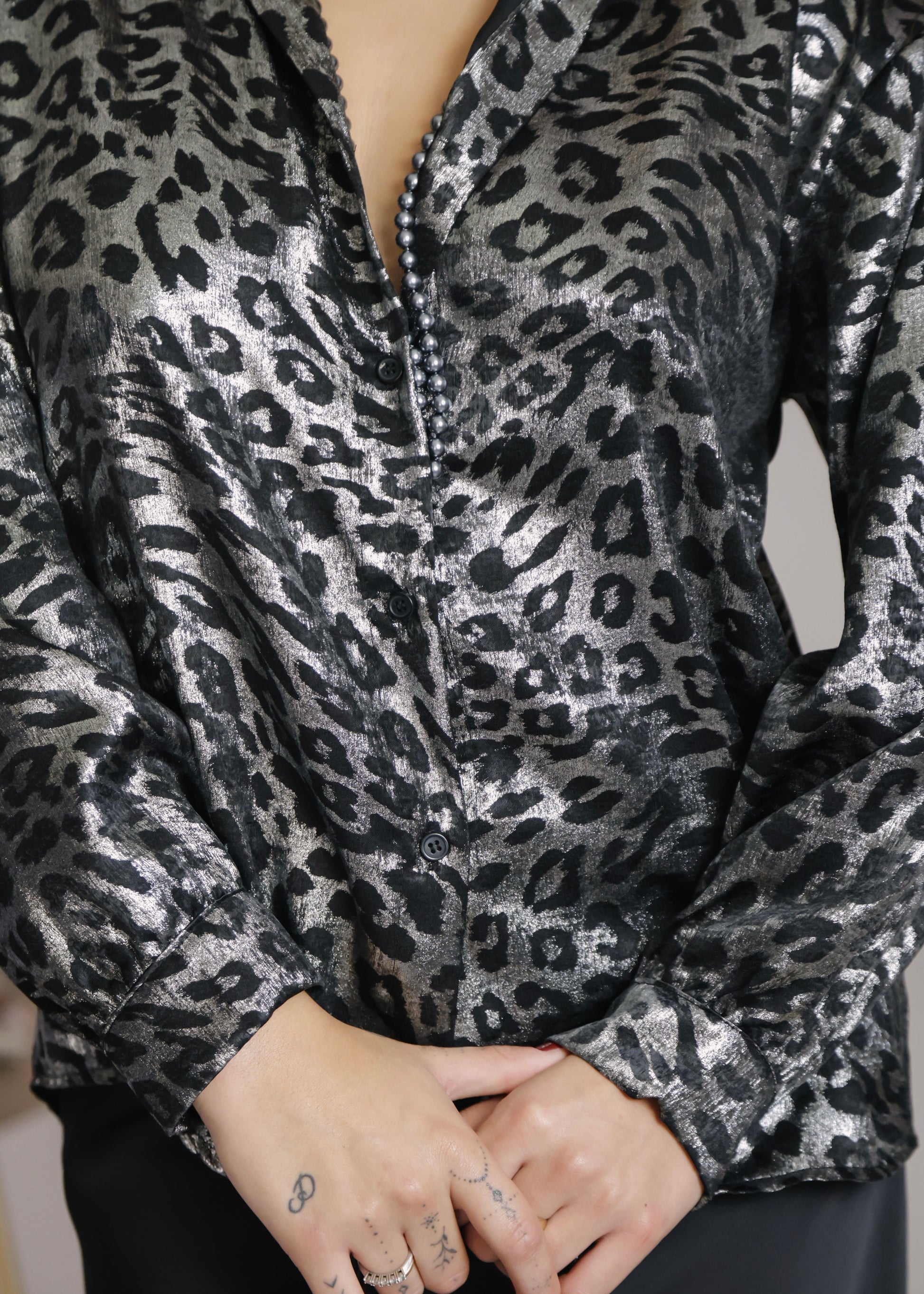 La camicia presenta una stampa maculata in lurex argento con macchie nere.