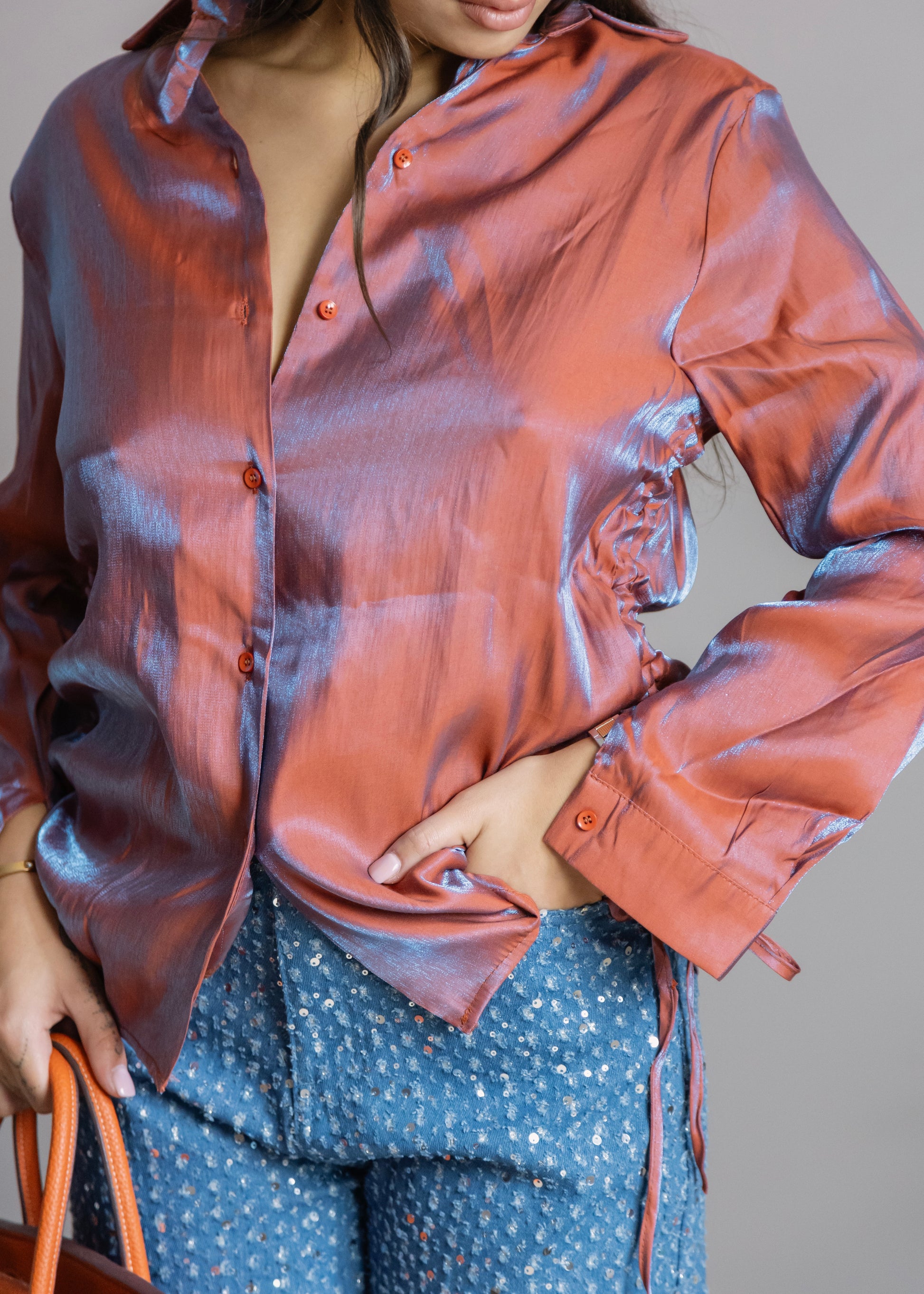 la camicia presenta una coulisse regolabile su entrambi i lati, donando un motivo arricciato.