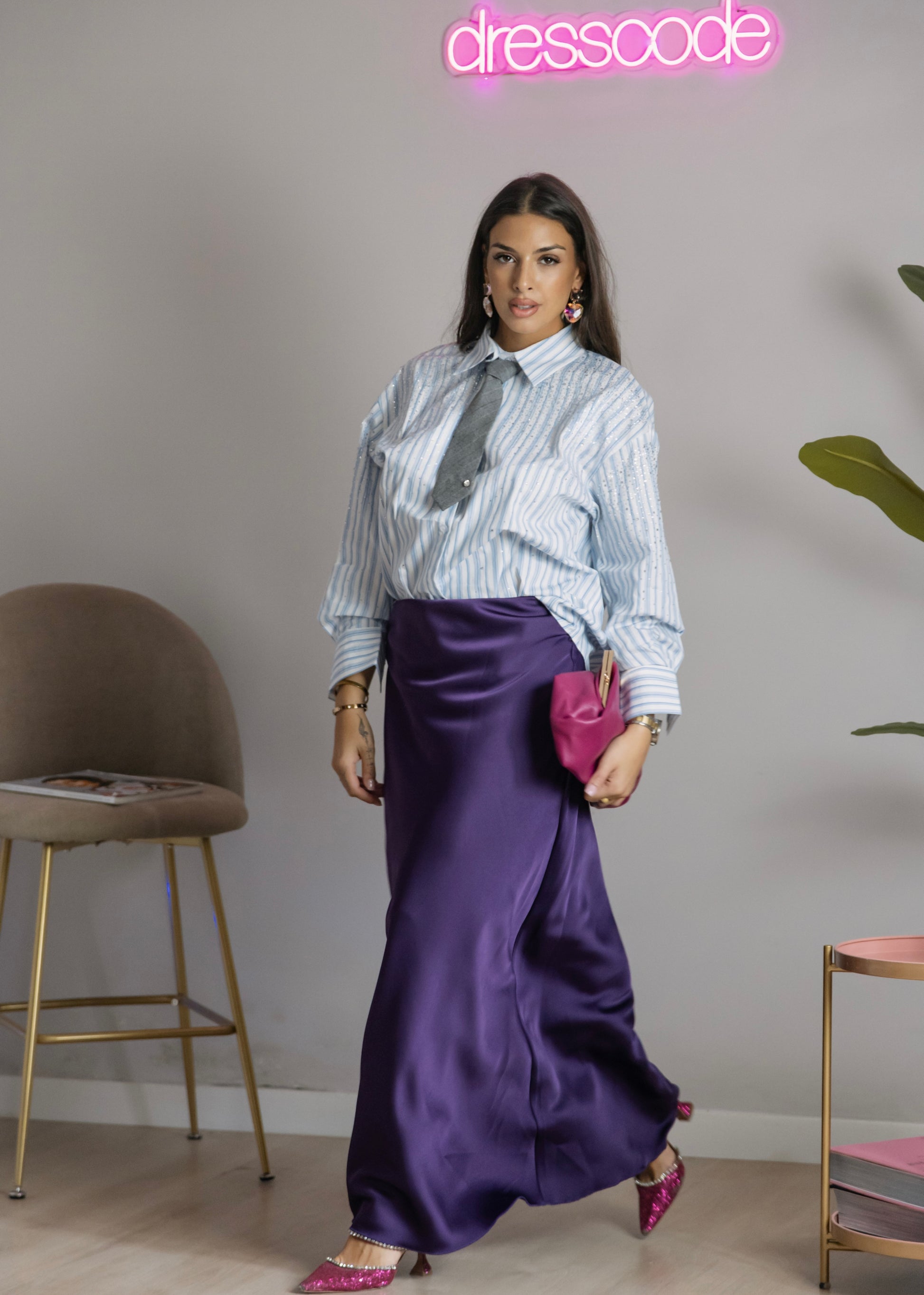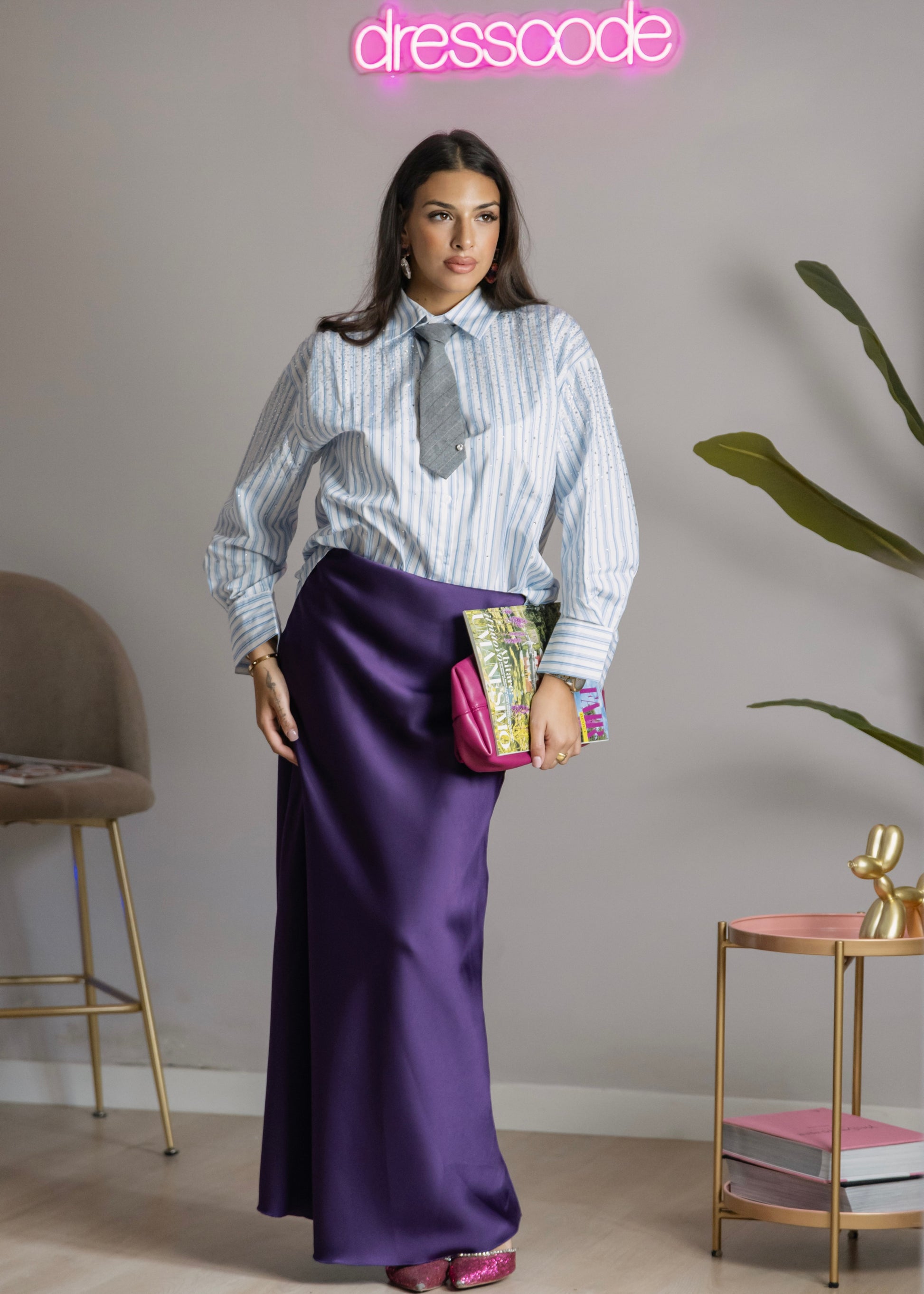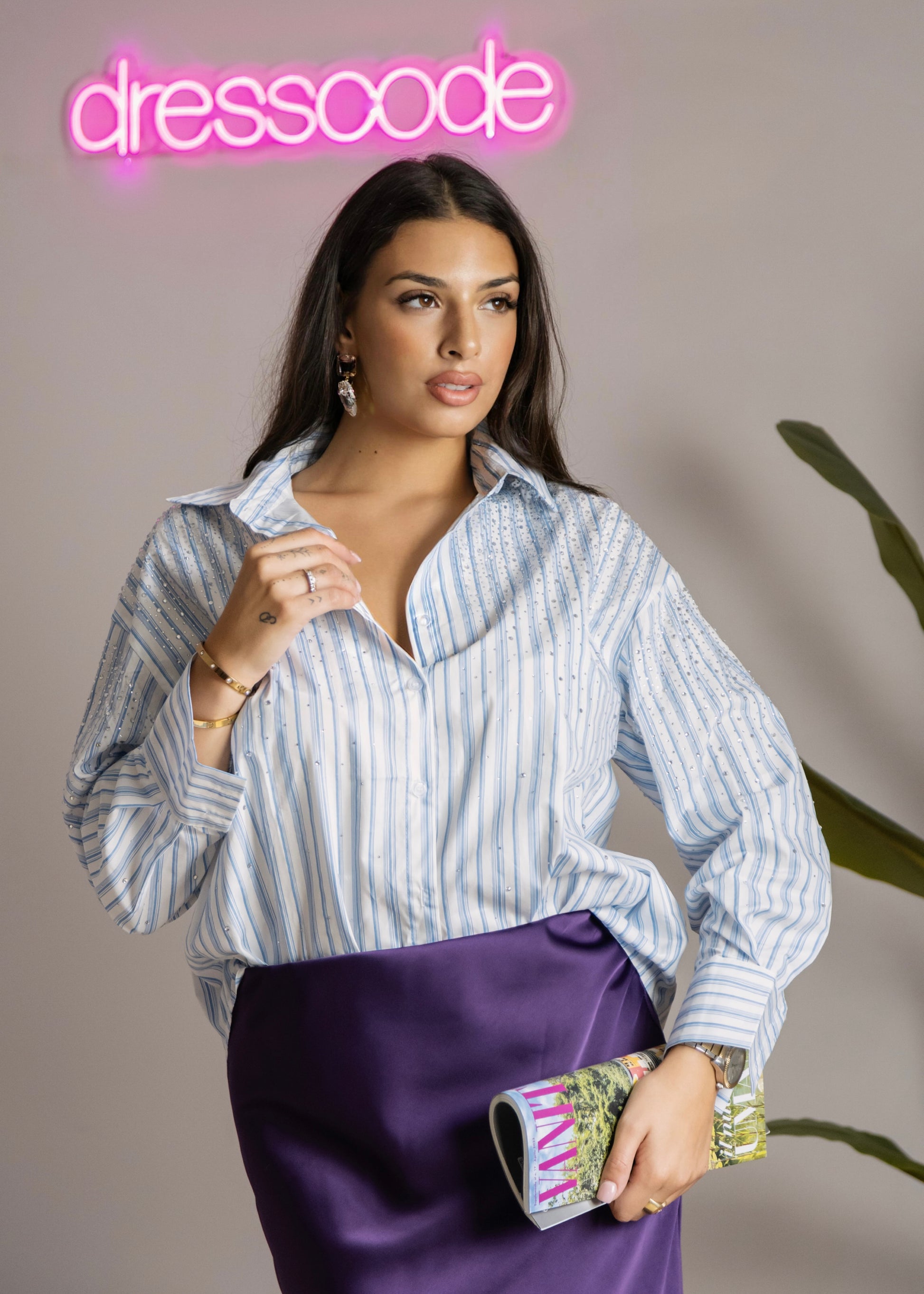 La camicia presenta strass di varie dimensioni, sparsi in quantità maggiore sulla parte superiore e minore sulla parte inferiore.
