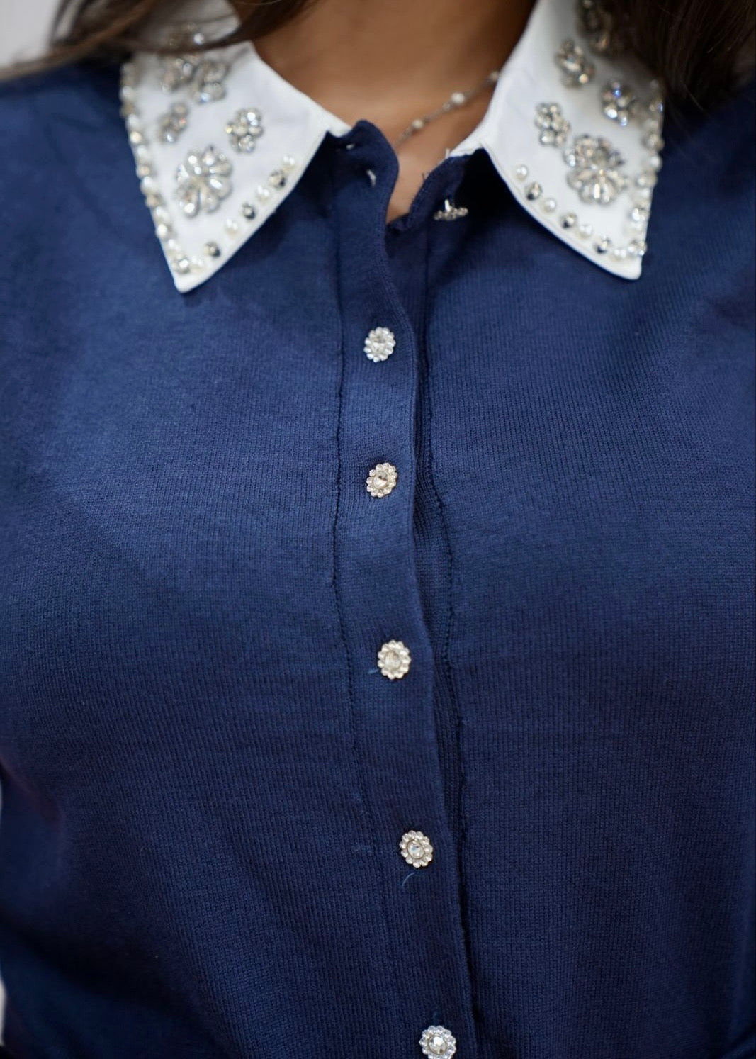 Il cardigan presenta un colletto in cotone bianco con applicazioni.