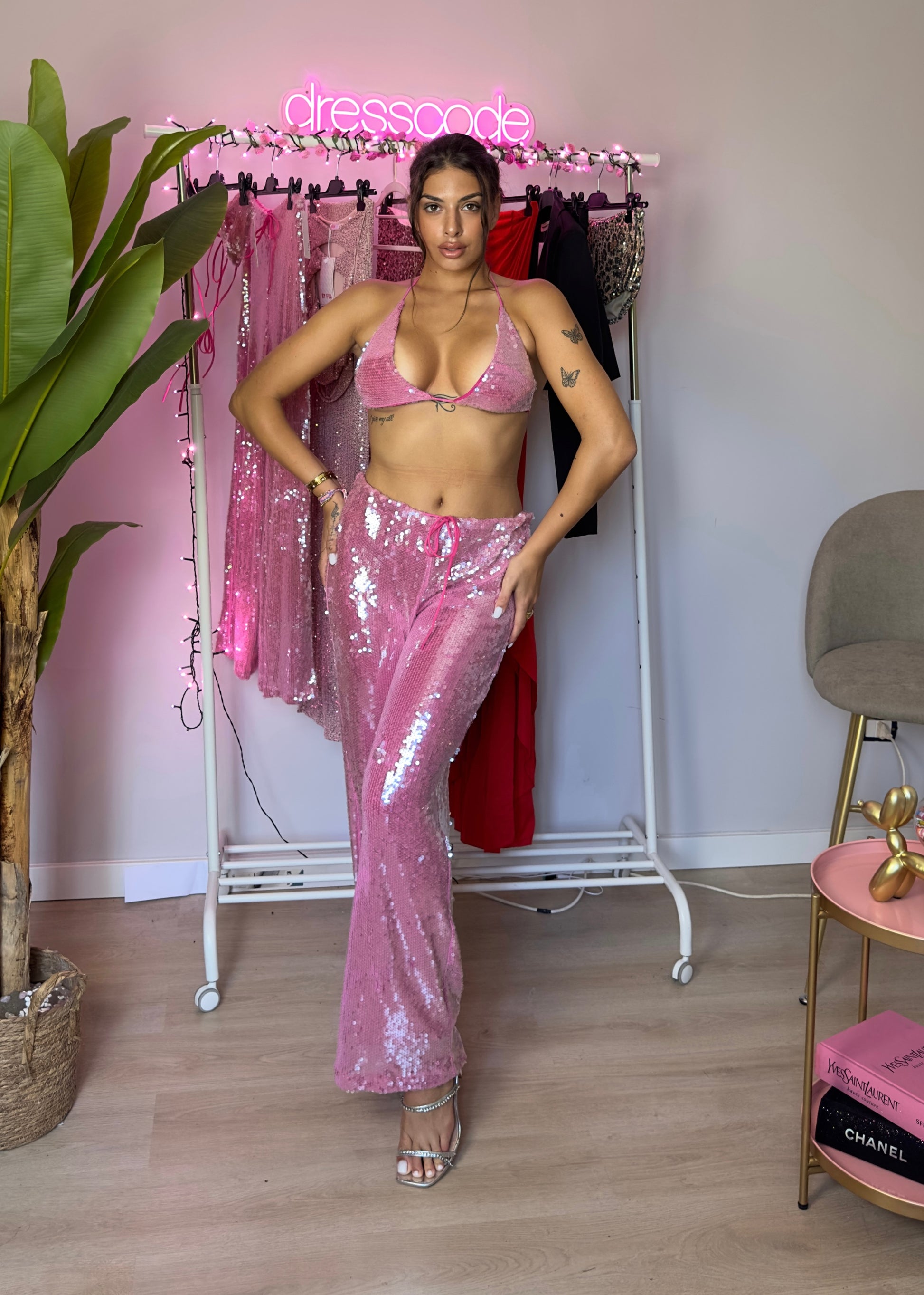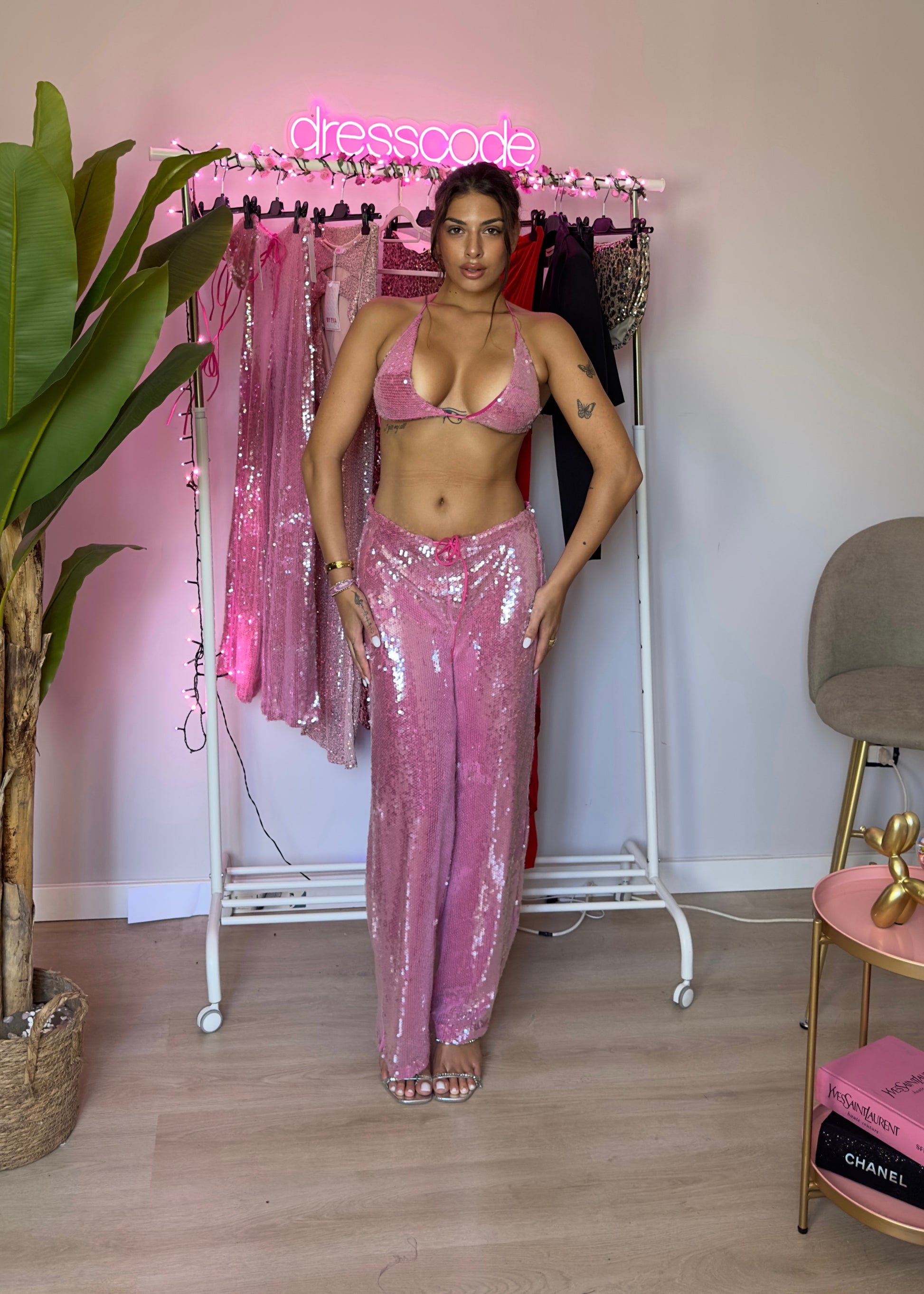 La parte superiore presenta un triangolino regolabile senza coppe completamente ricoperto da paillettes rosa.