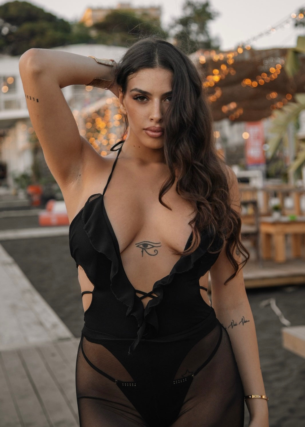 Coordinato composto da un body sgambato elasticizzato, chiuso al centro da dei laccetti e adornato con delle rouches tra il seno e l'addome.
