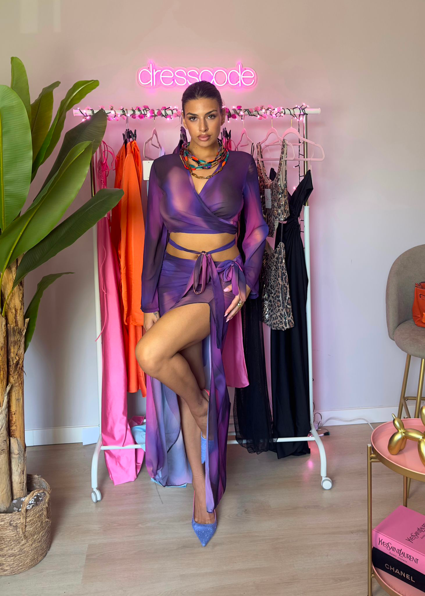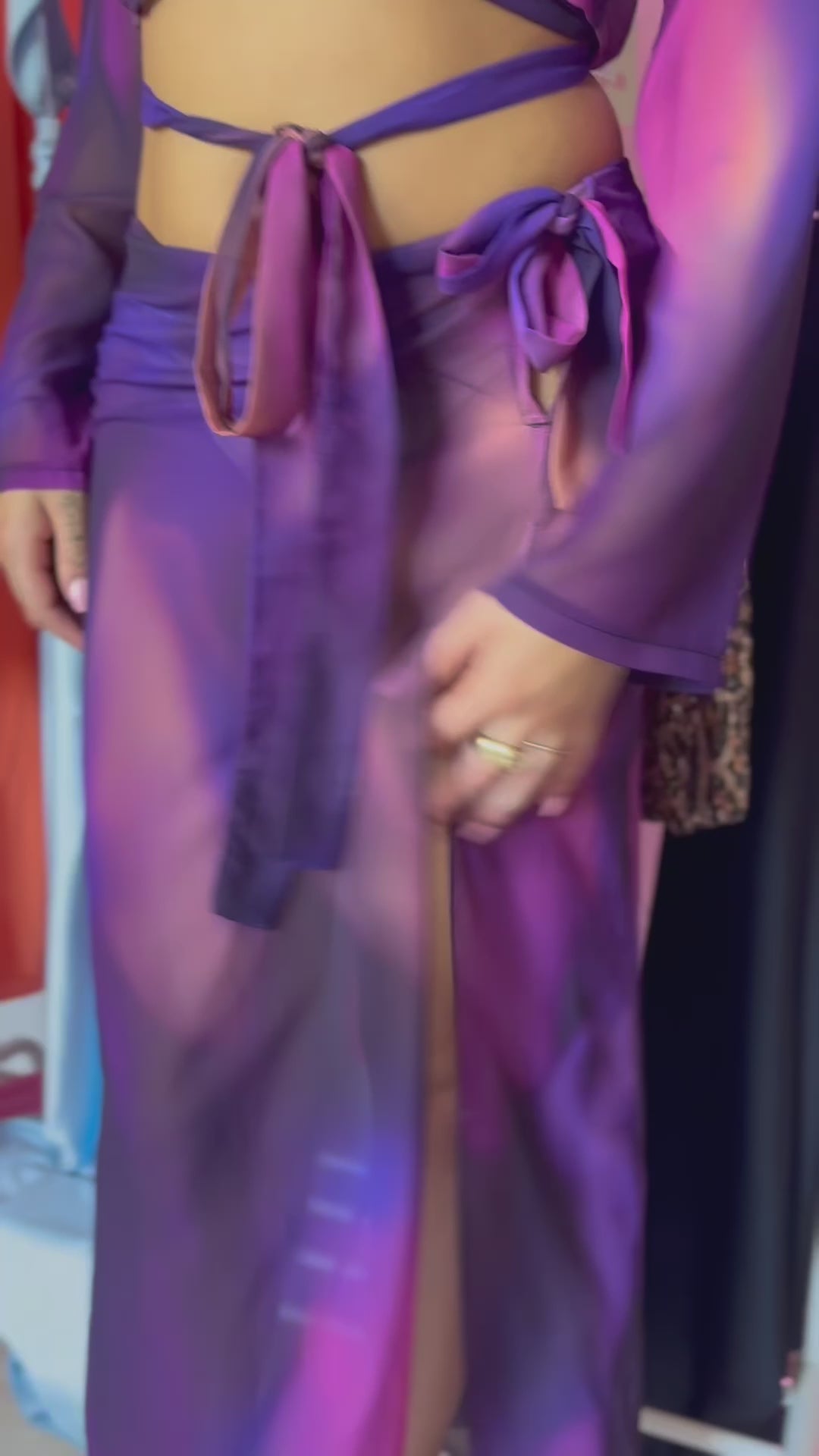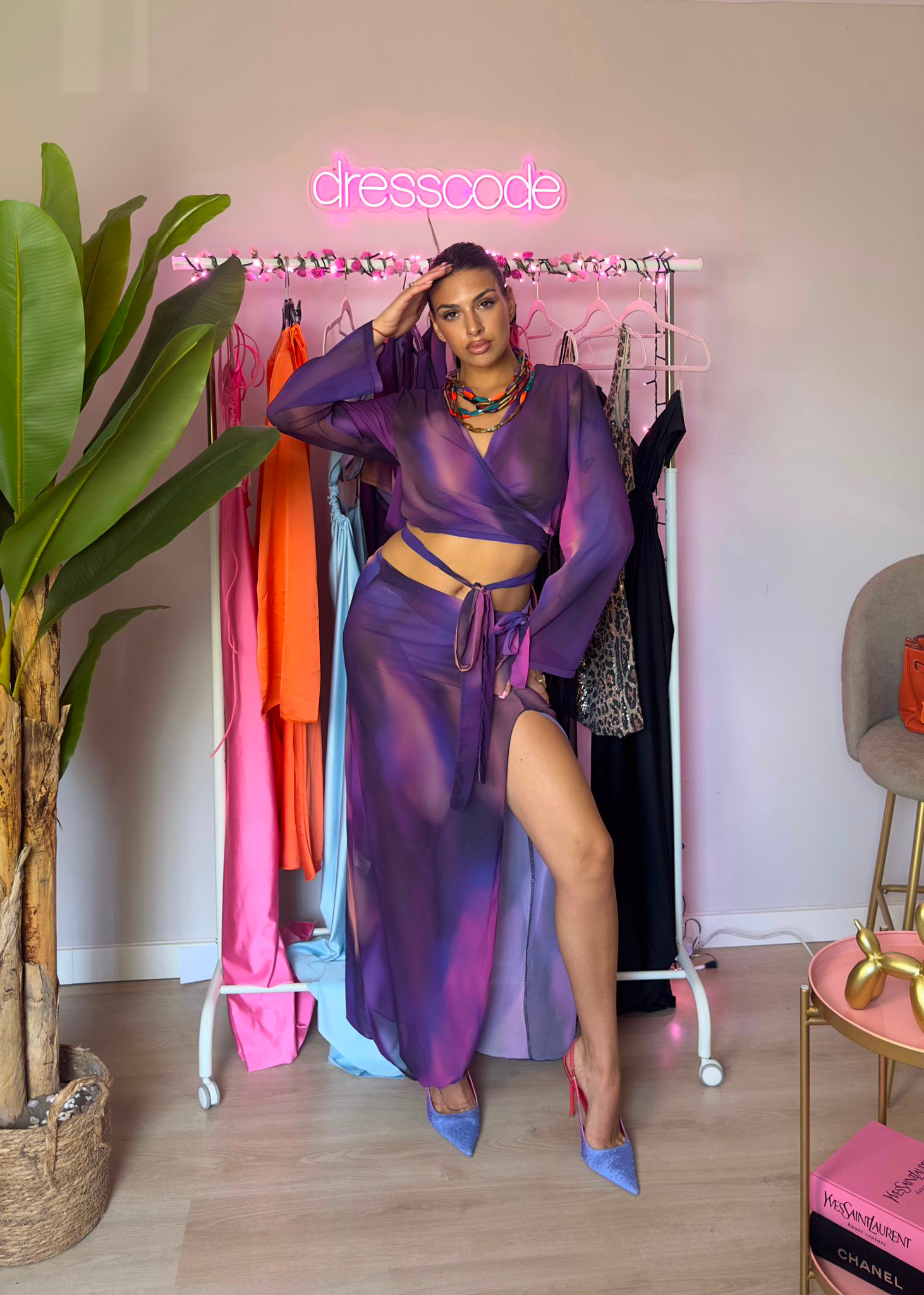 Coordinato composto da una camicia in velo crop abbastanza coprente senza bottoni, chiusa da una fusciacca.
