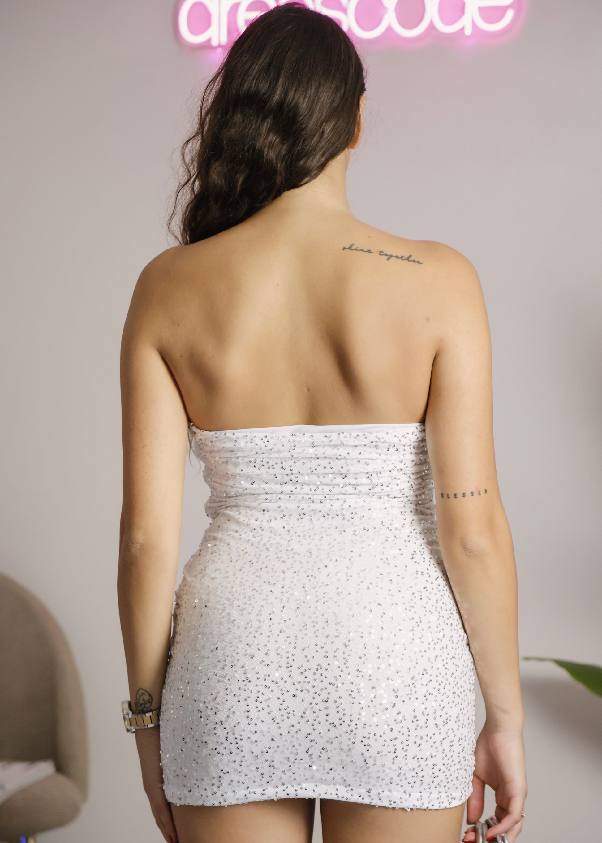 L'abito è caratterizzato dalla presenta di paillettes argentate su tutto il tessuto.