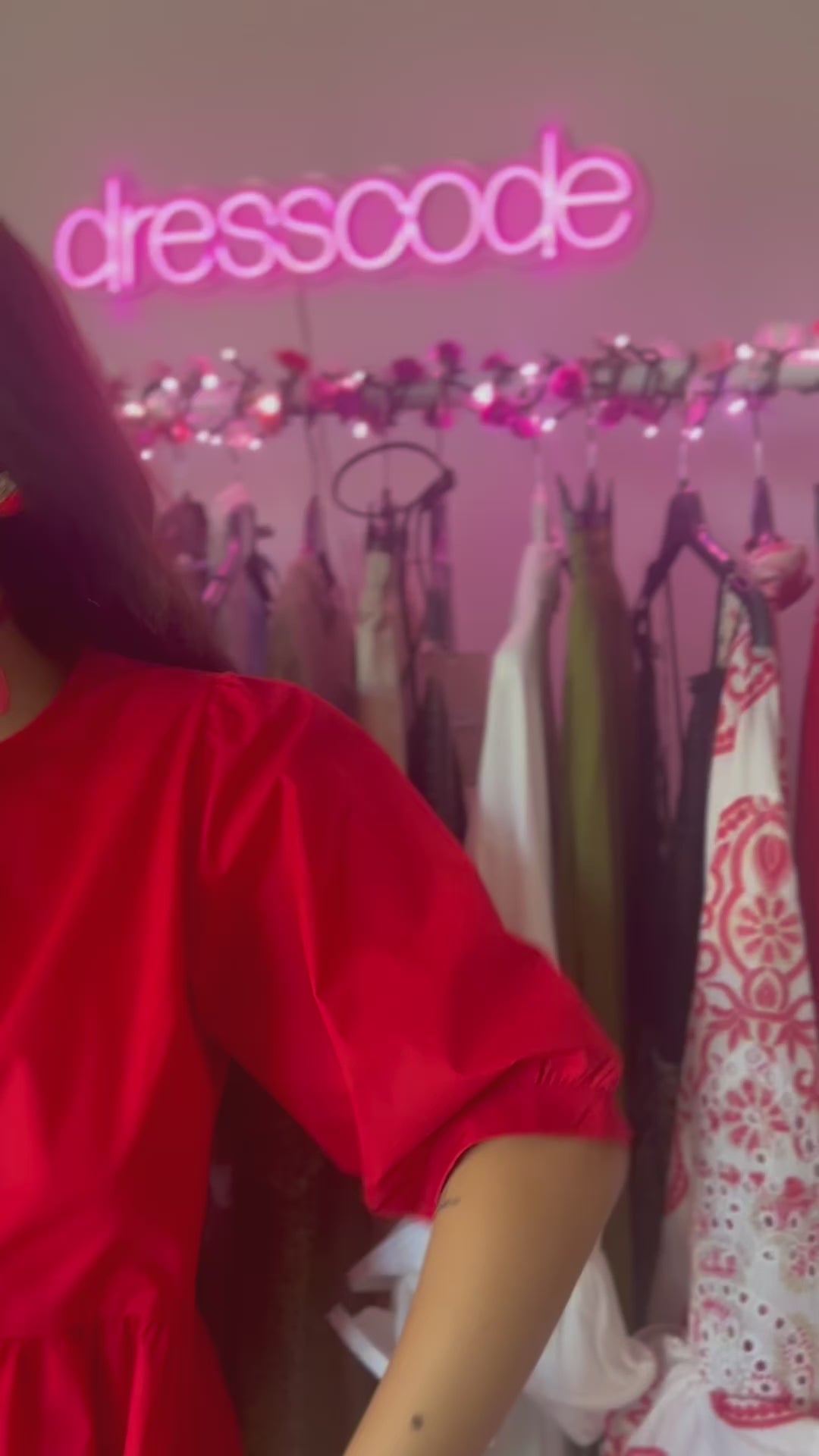 Abito corto in cotone, leggermente ampio, con scollo a V profondo chiuso da tre lacci.