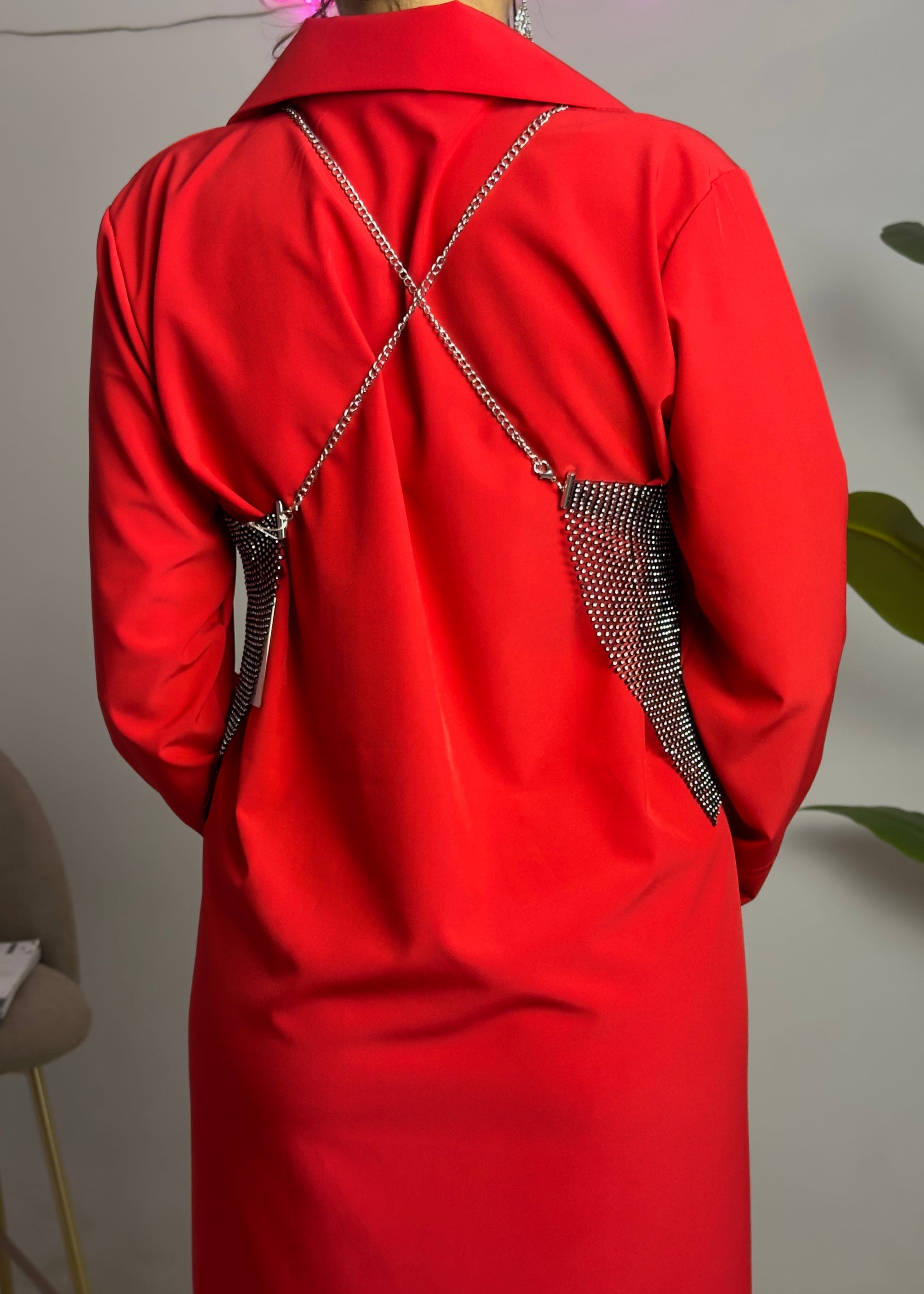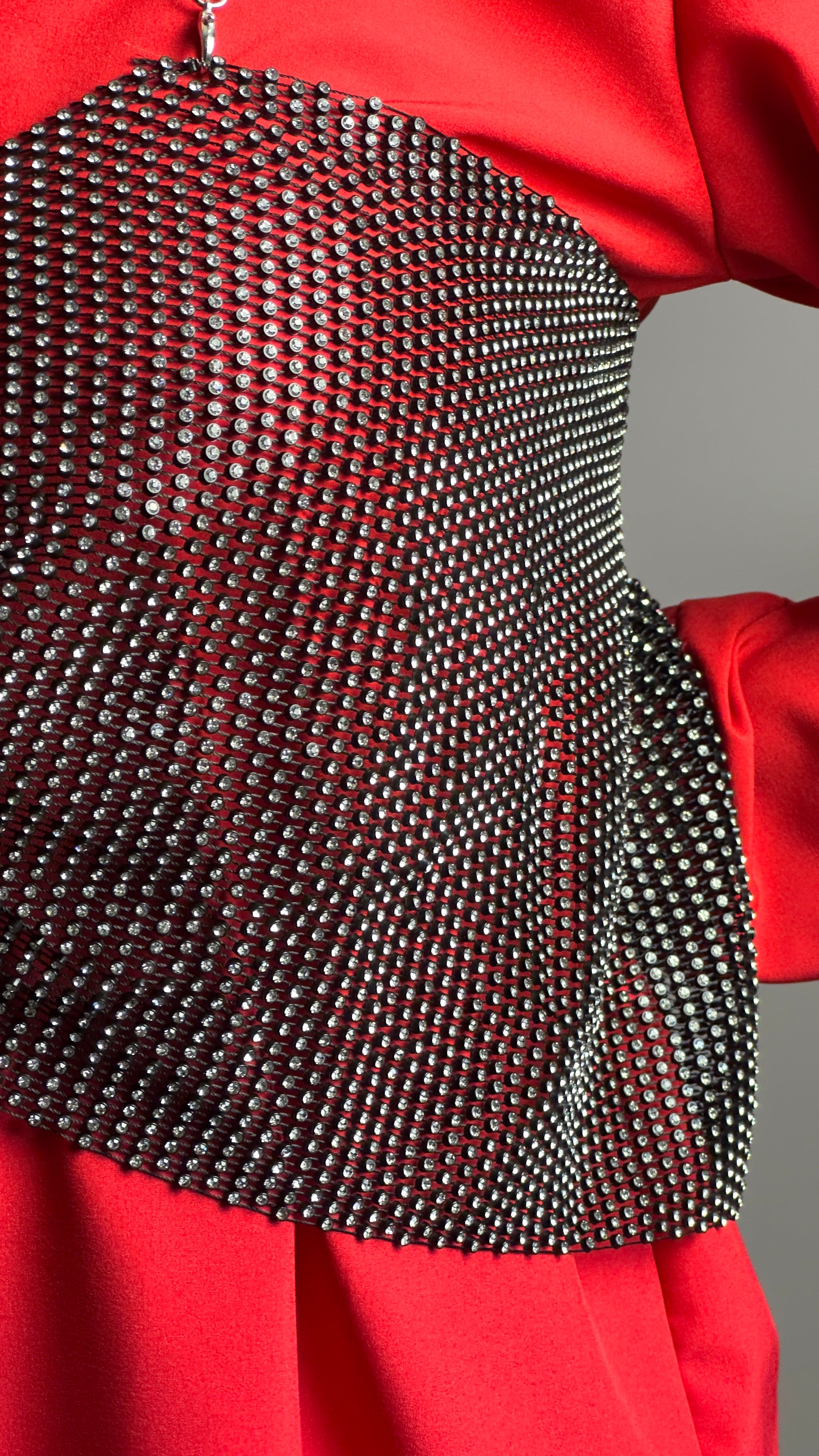 L'abito è impreziosito da un top rimovibile composto da una rete nera brillantinata con un piercing argentato centrale.