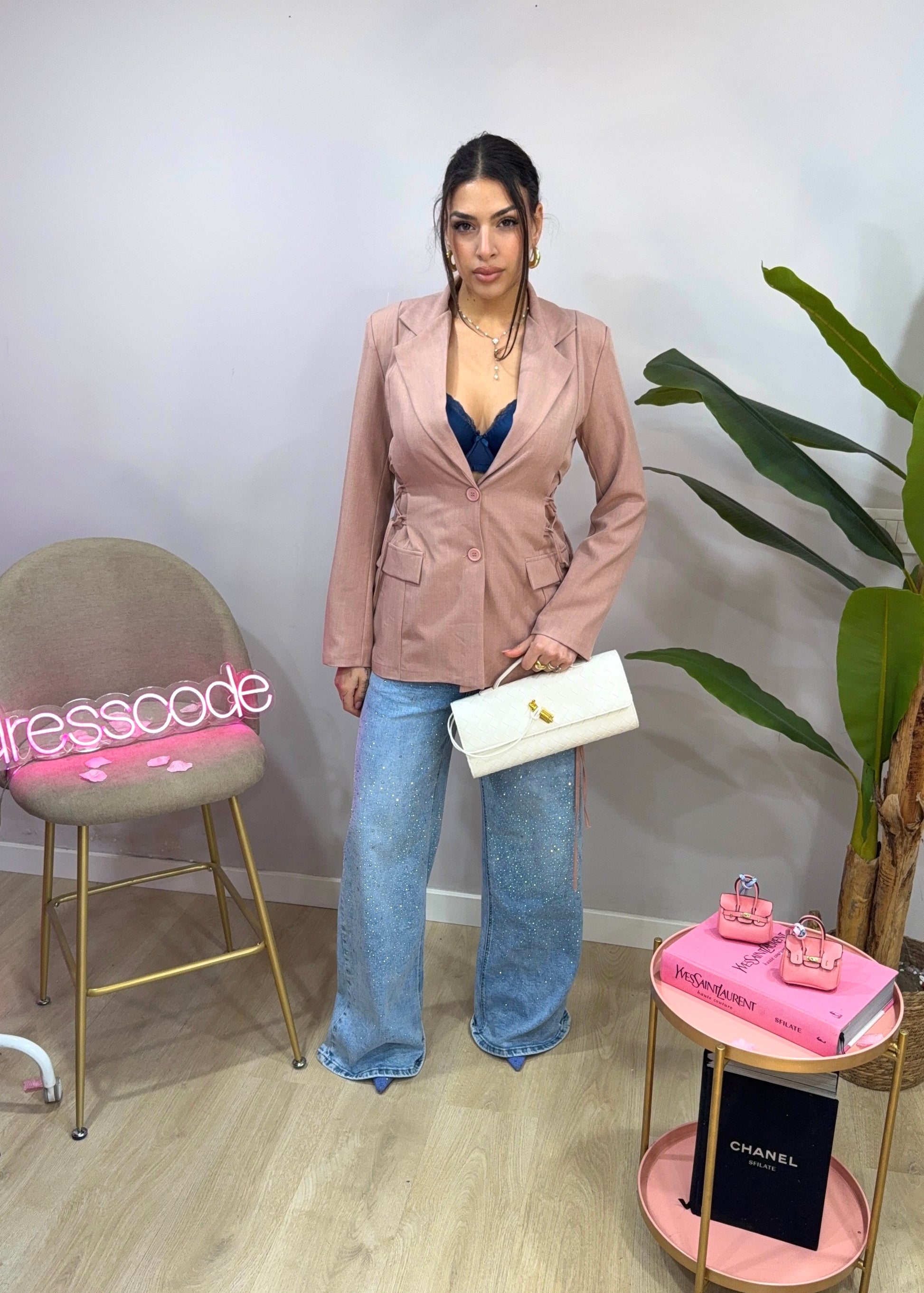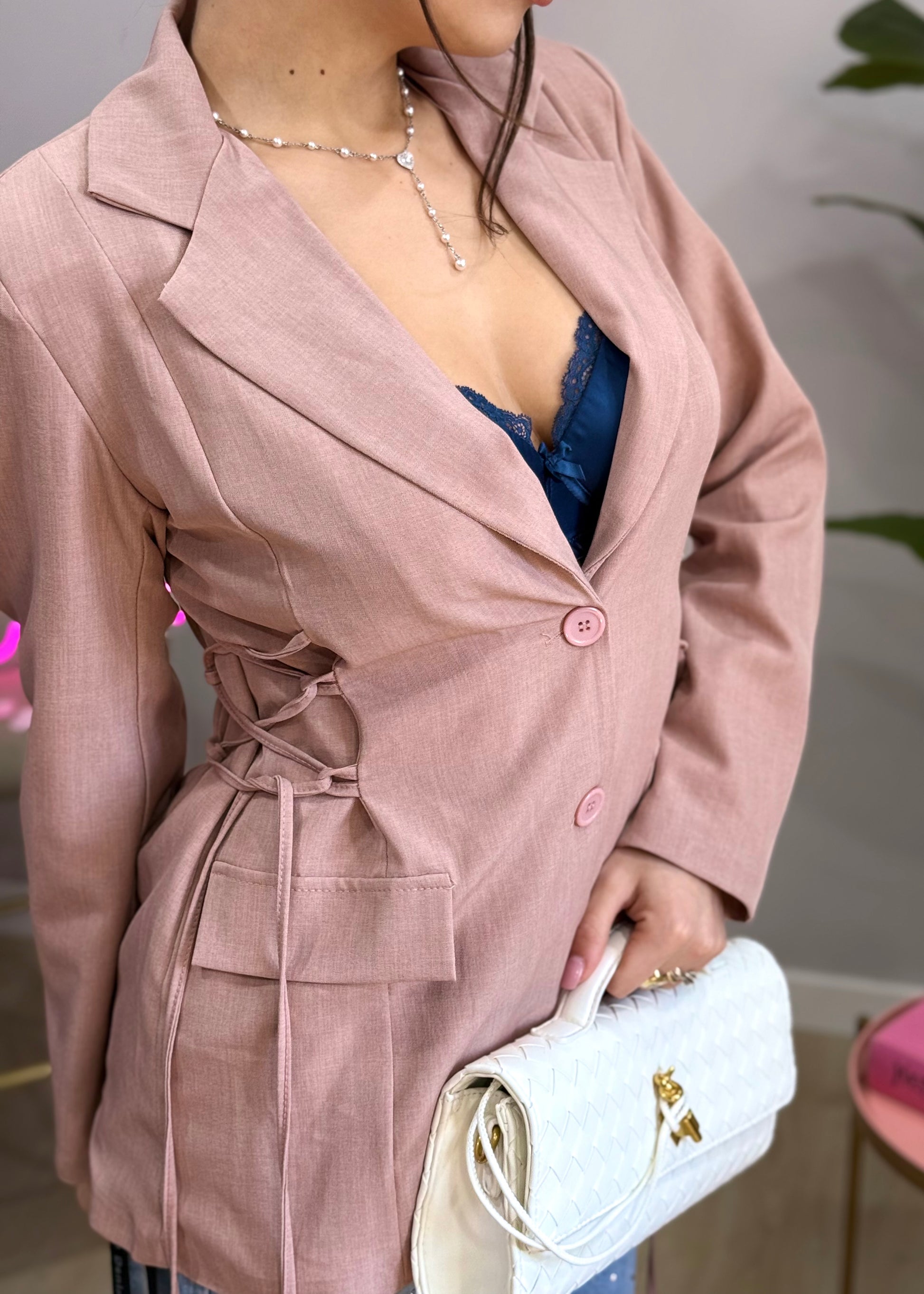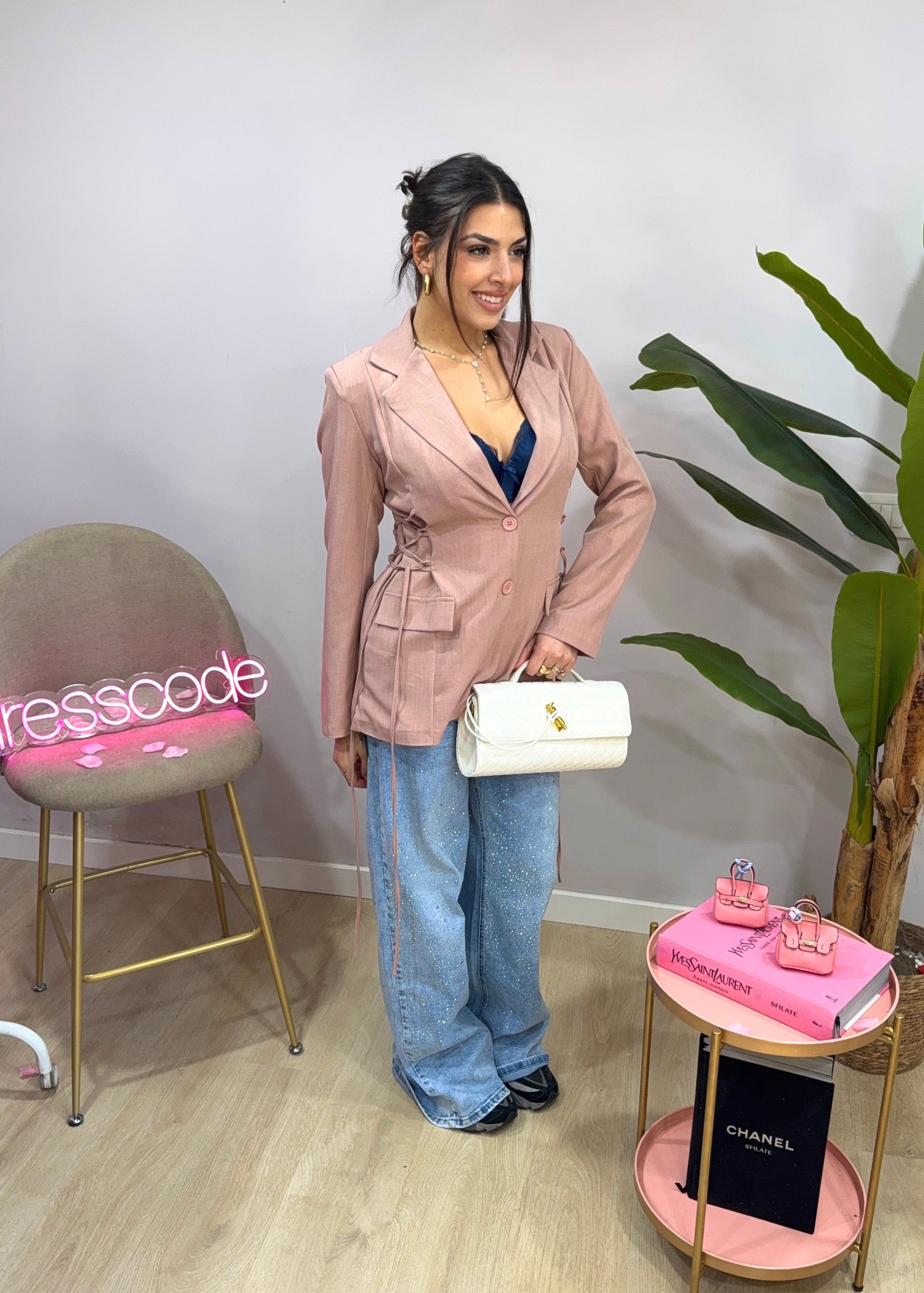 Presenta due tasche finte ed è arricchita da lacci modellanti e regolabili sui fianchi, studiati per valorizzare il punto vita con eleganza.