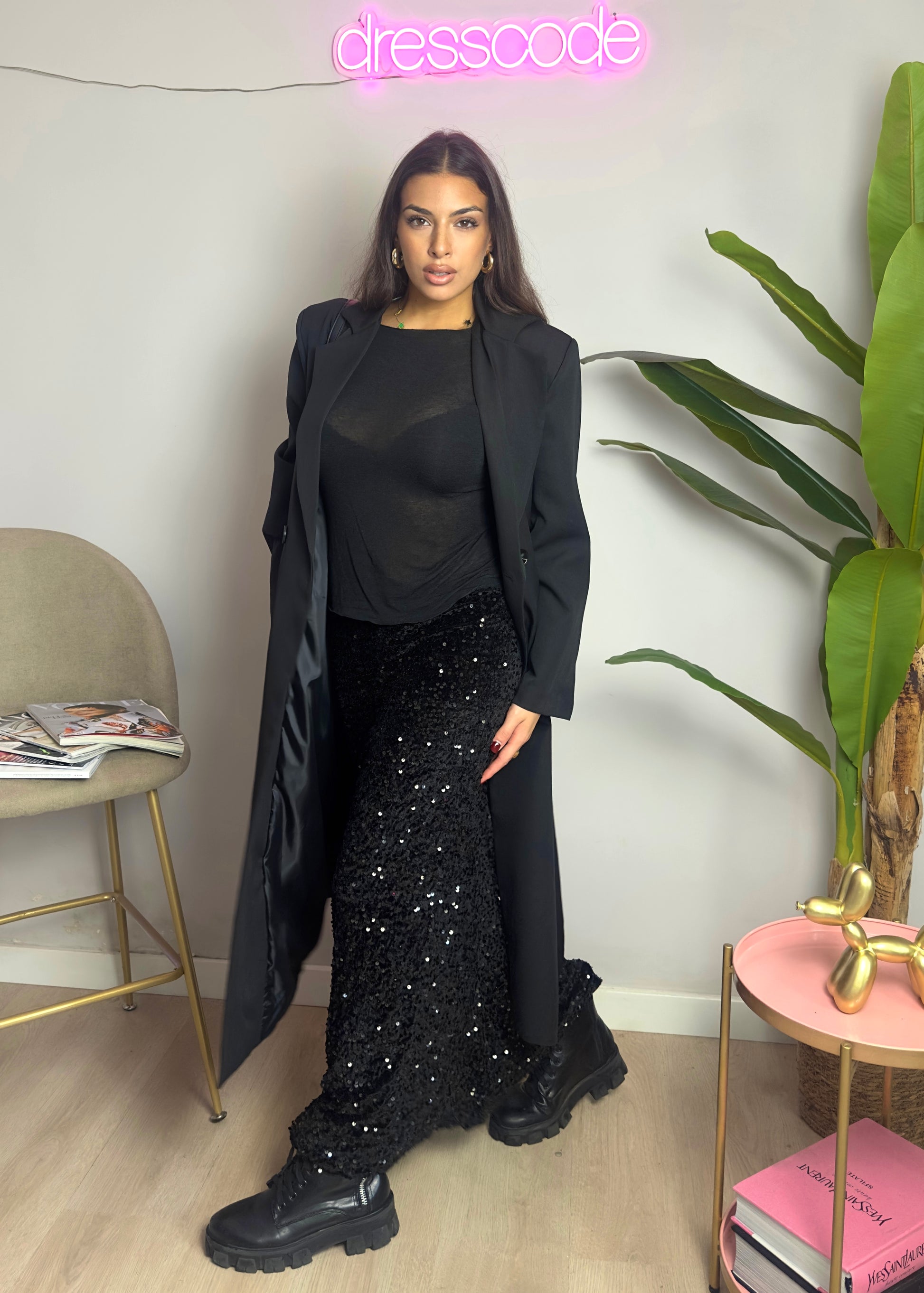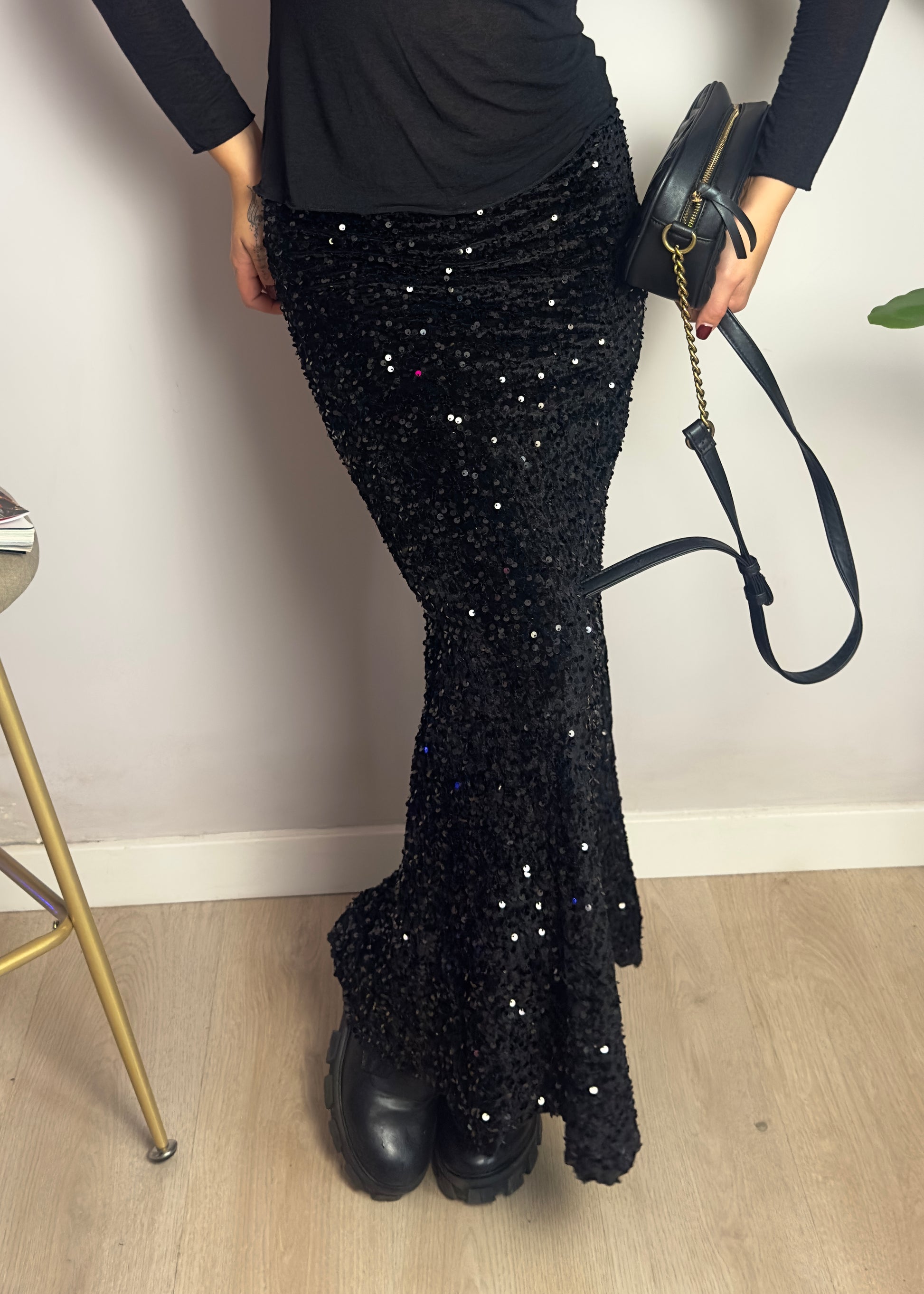 La gonna è piena di paillettes tono su tono che la illuminano.