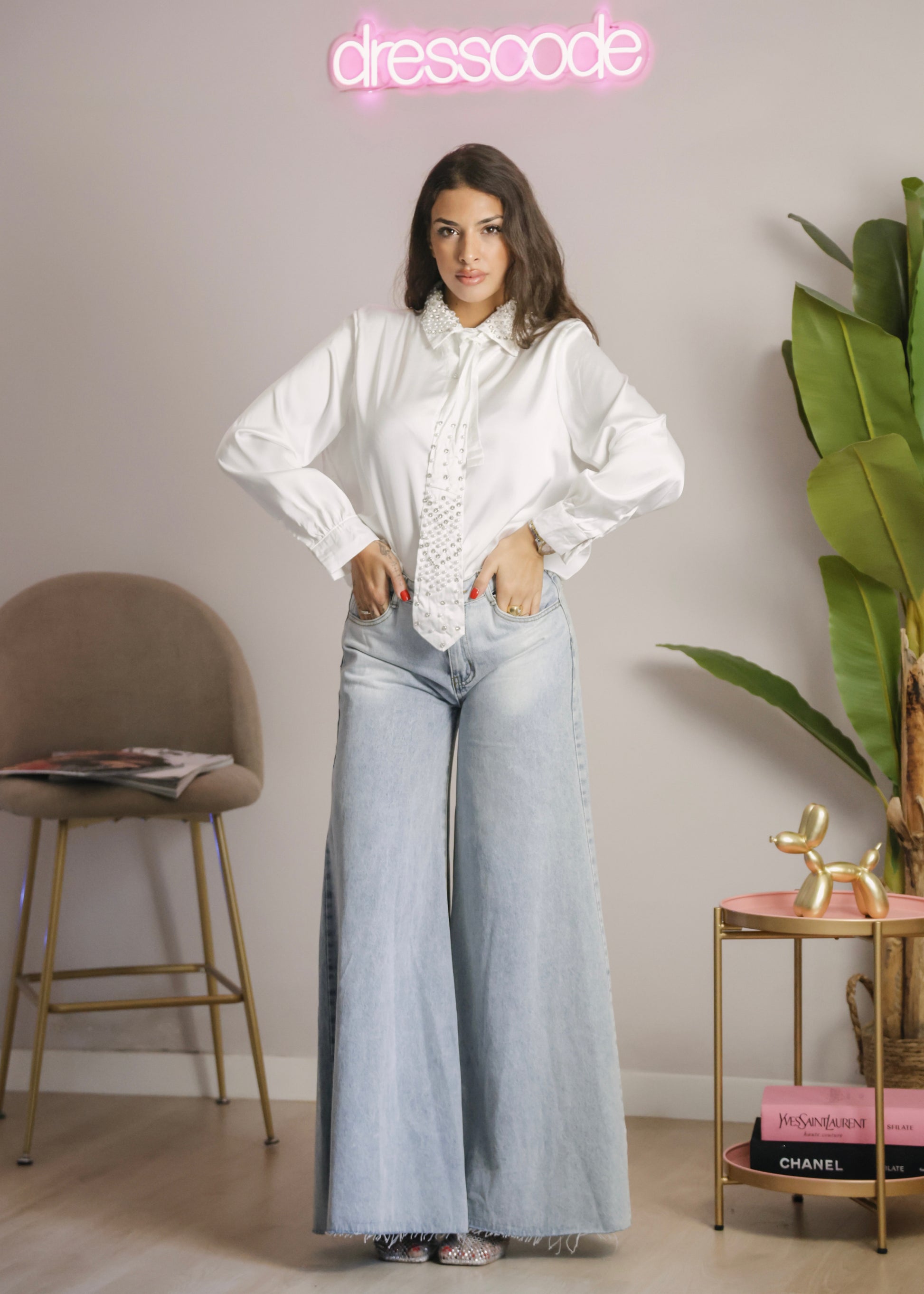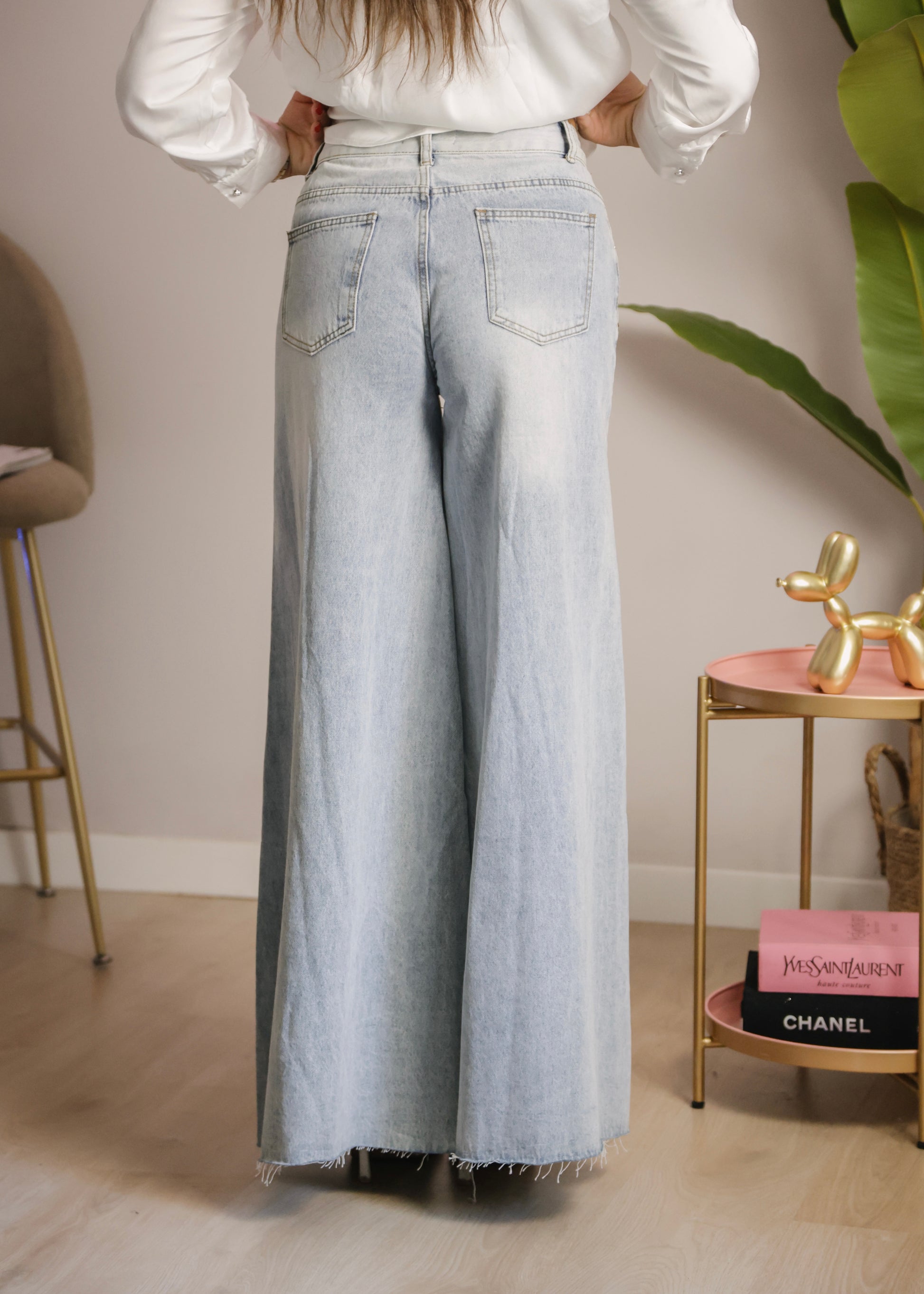 Il jeans è caratterizzato da una gamba extra larga.
