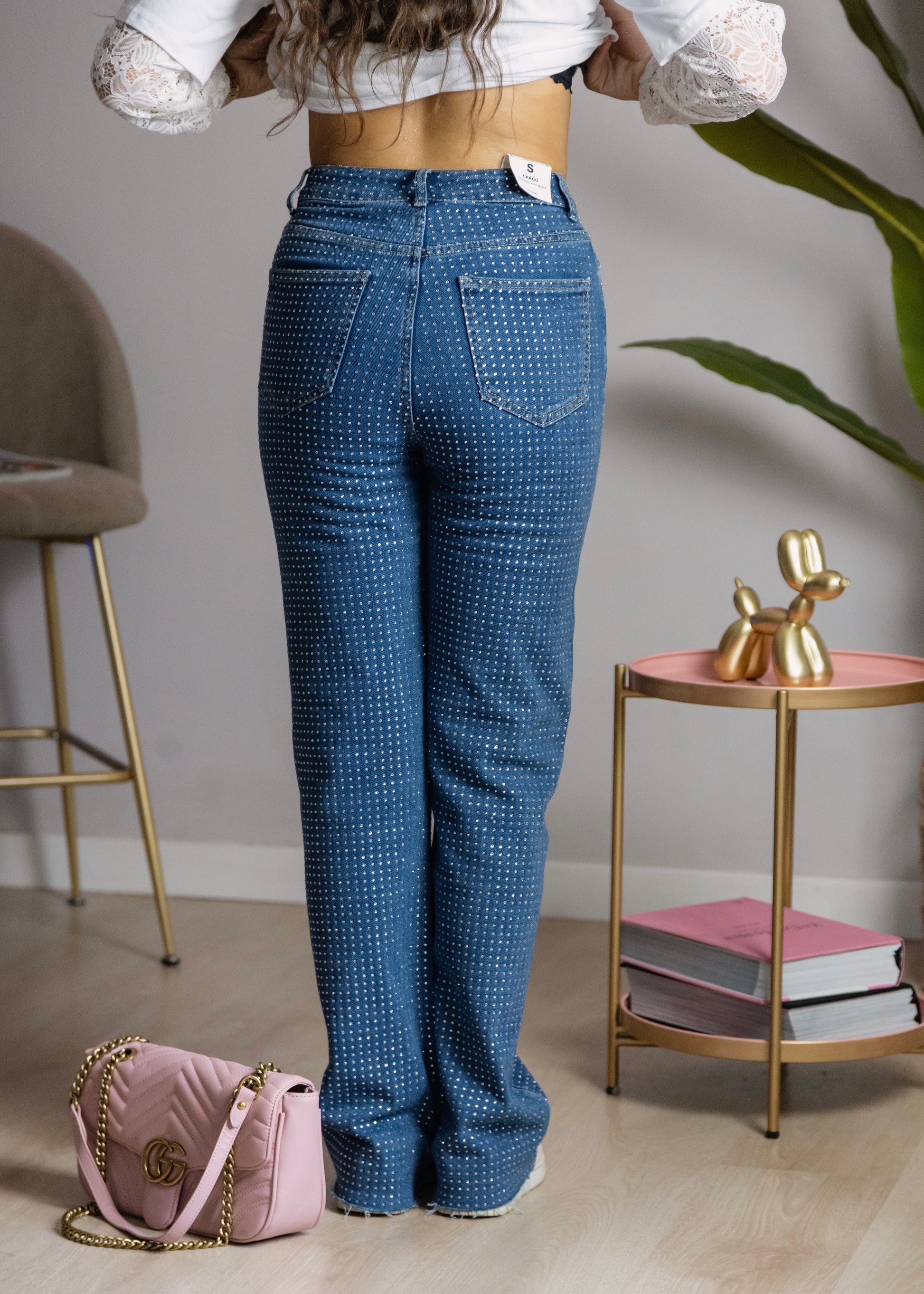 Il jeans è caratterizzato dalla presenza di strass sia sulla parte anteriore che posteriore.