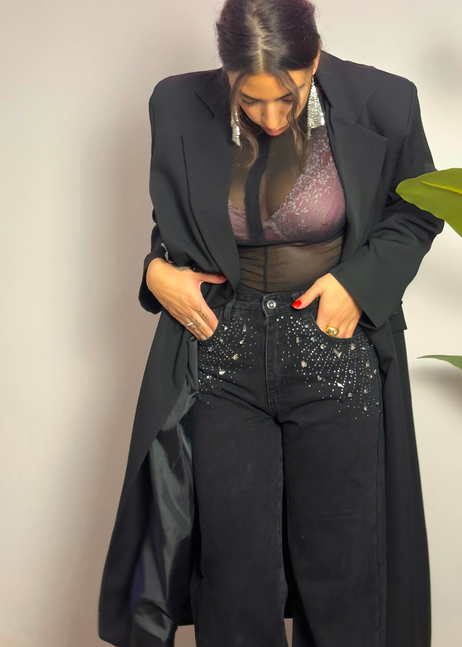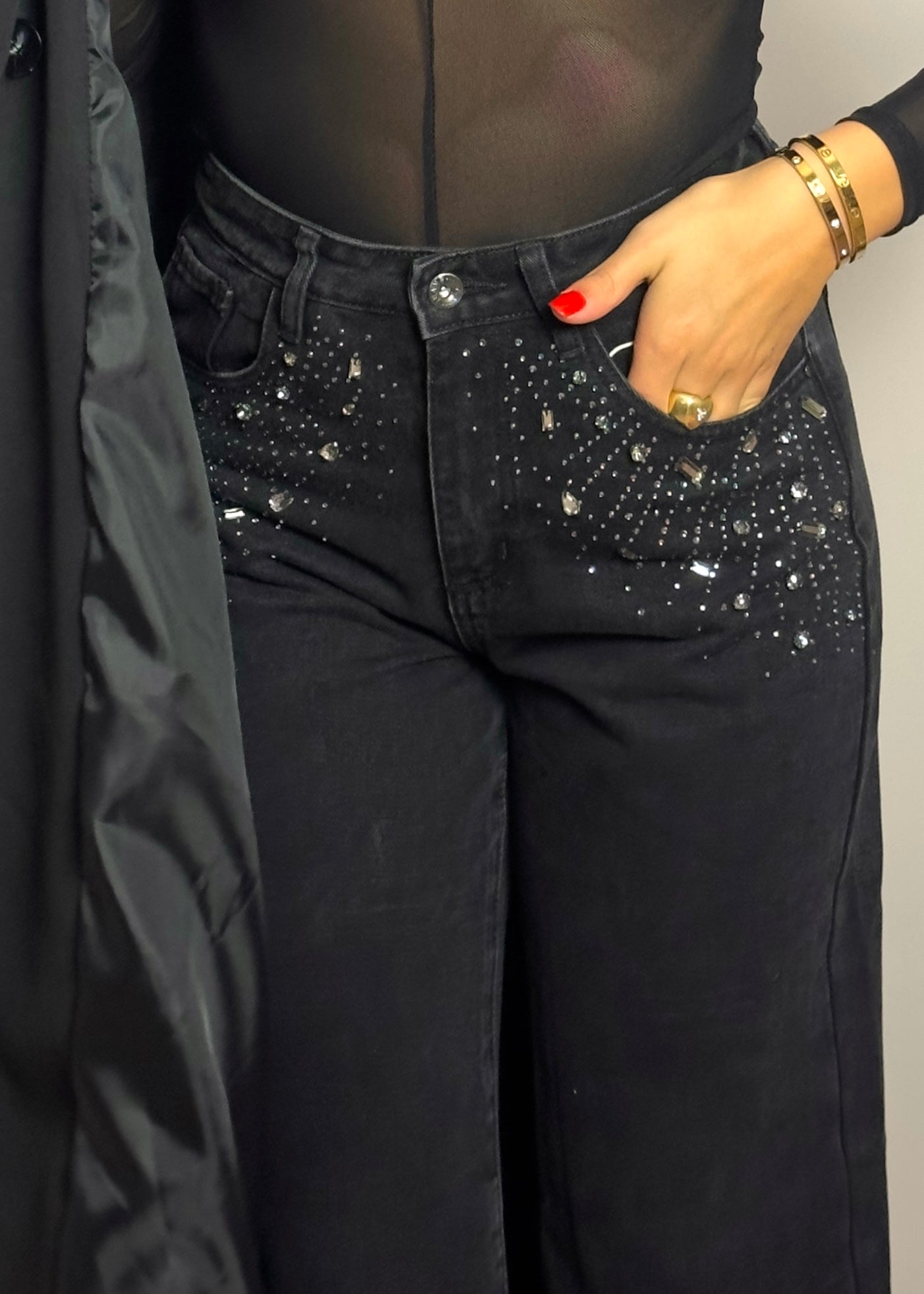 La particolarità del jeans la troviamo intorno le tasche anteriori, dove vi sono applicati Swarovski argento di diverse forme e dimensioni che, grazie alla loro disposizione creano dei raggi.