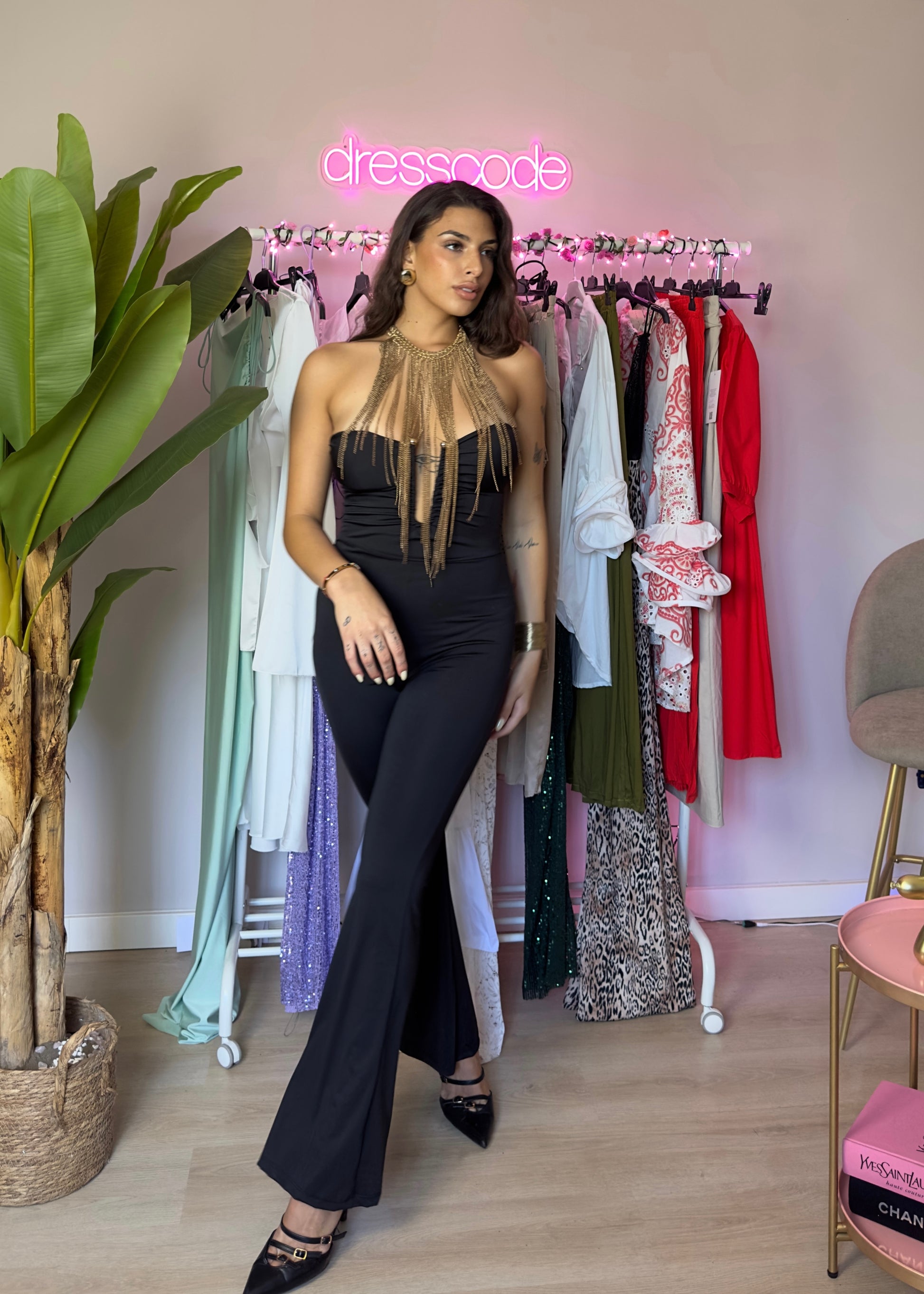 Presenta uno scollo leggermente a cuore, spezzato da una stecca interna dorata le cui estremità fuoriescono, creando un effetto ‘piercing’.
