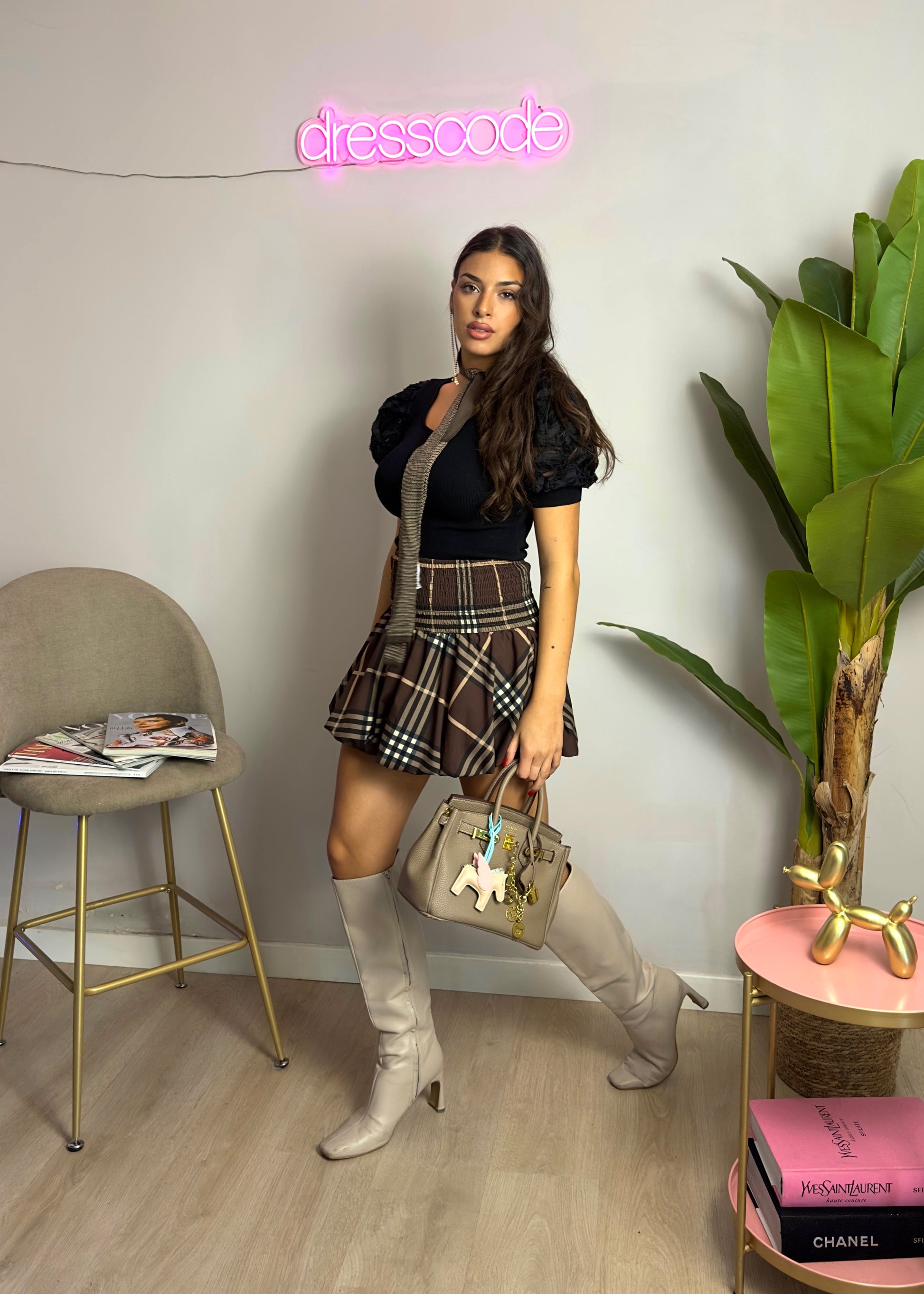 La gonna presenta una stampa tartan sui toni del marrone.