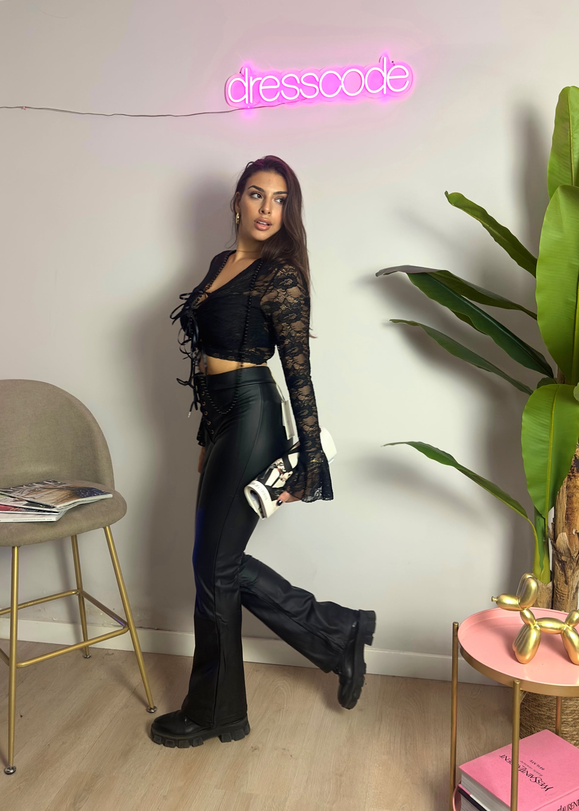 Pantalone a zampa con vita alta in ecopelle.