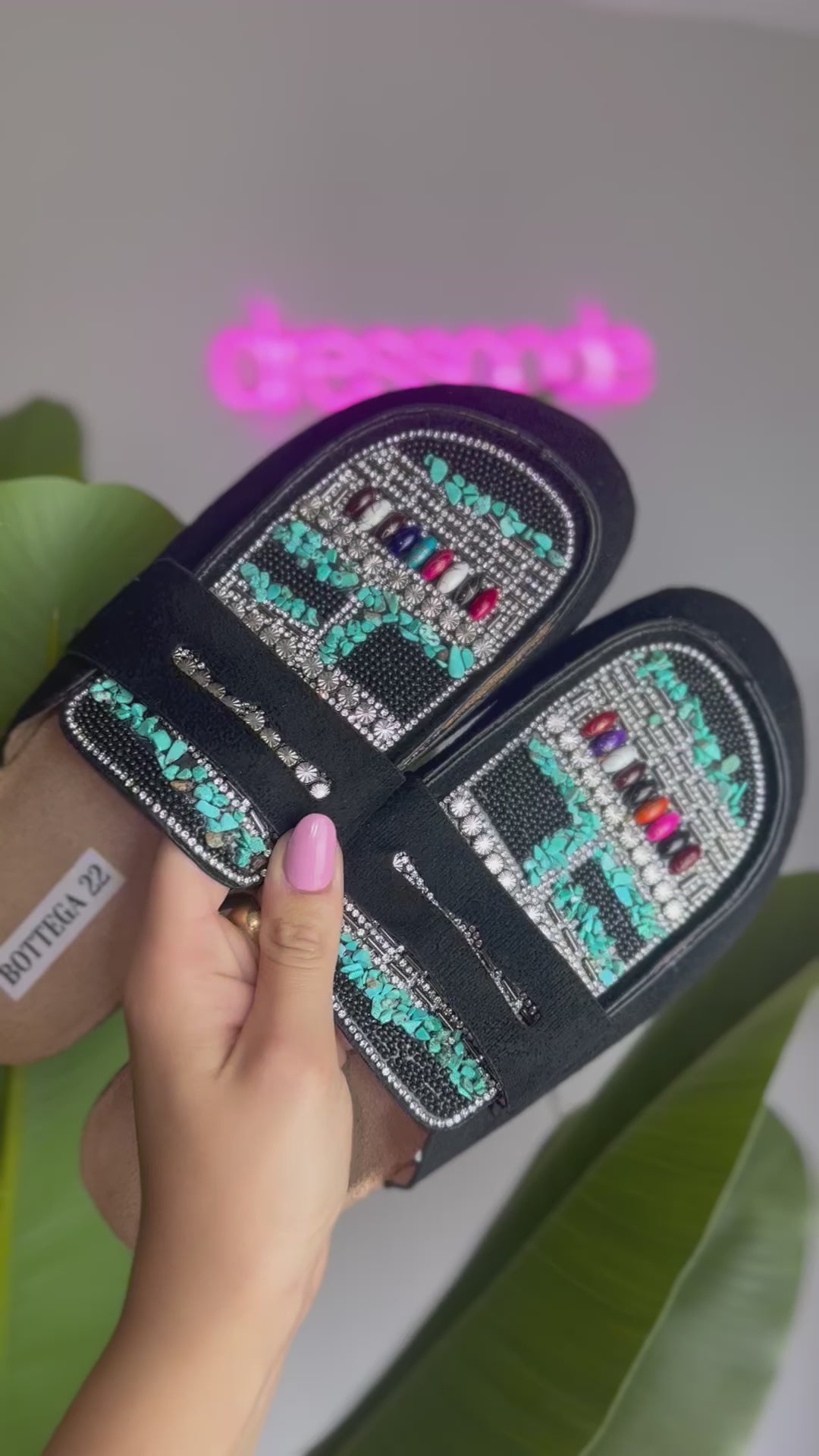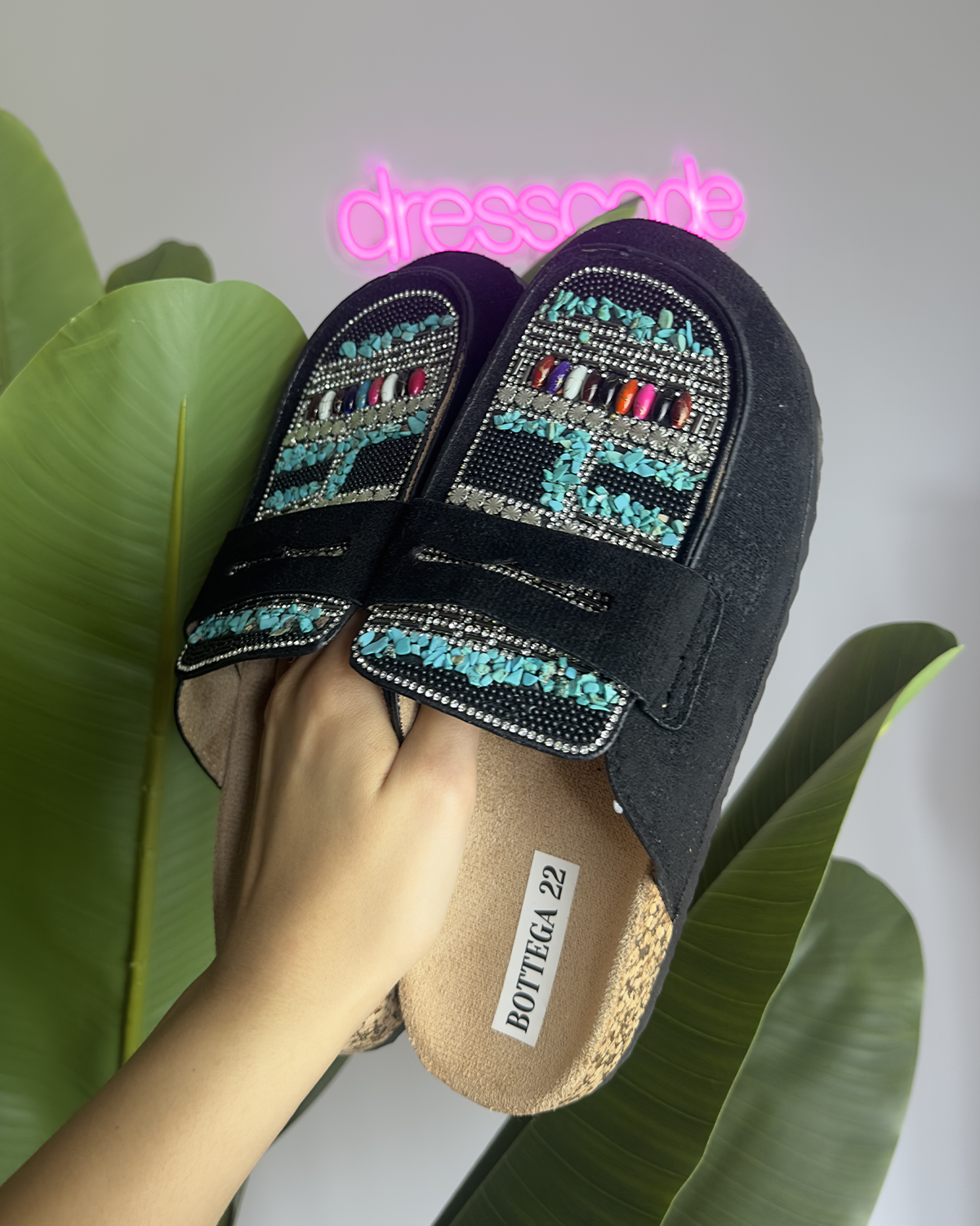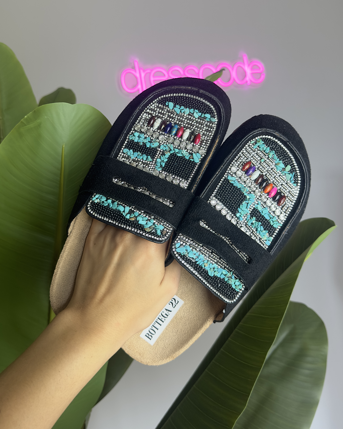Sabot nero in camoscio impreziosito da applicazioni di pietre colorate e brillantini.