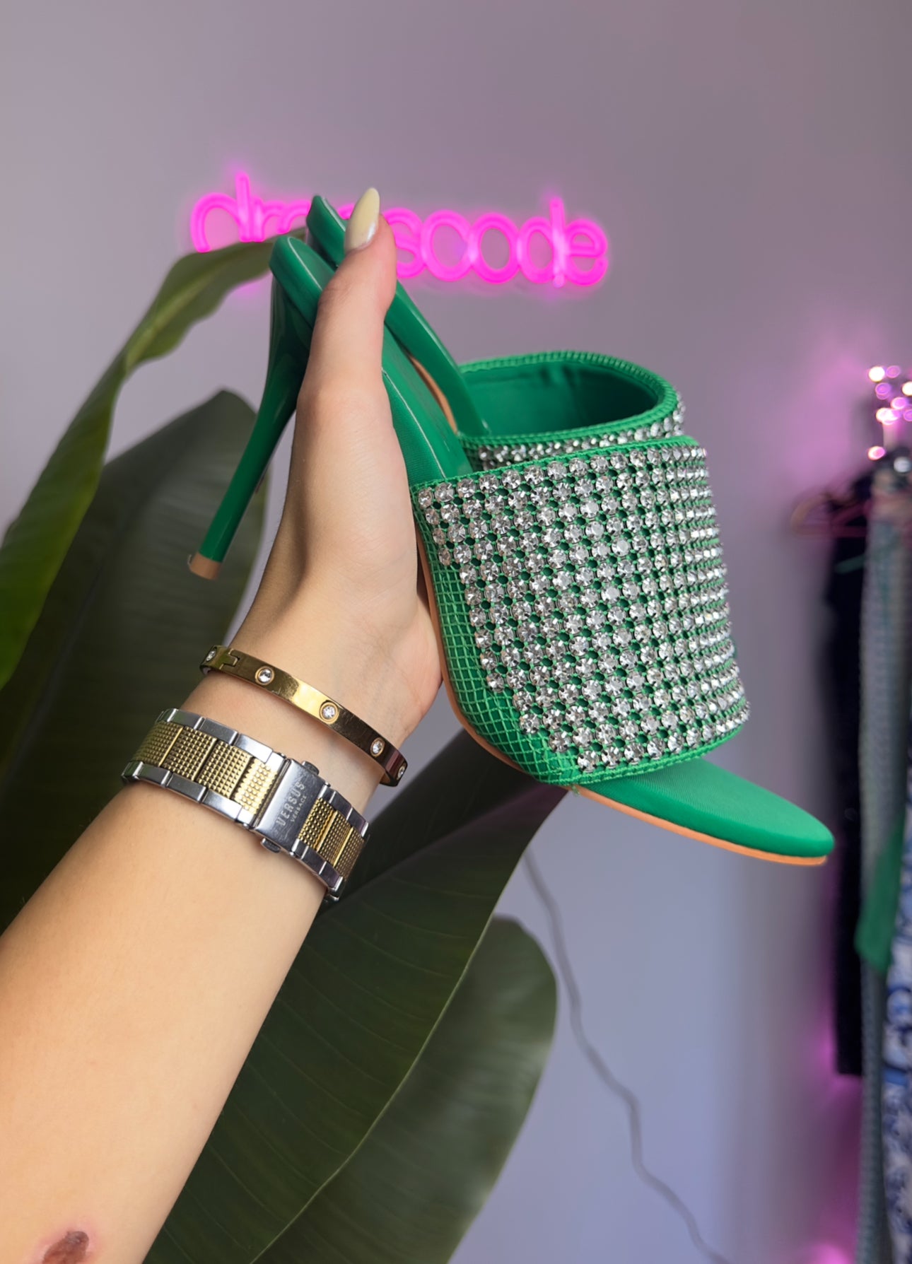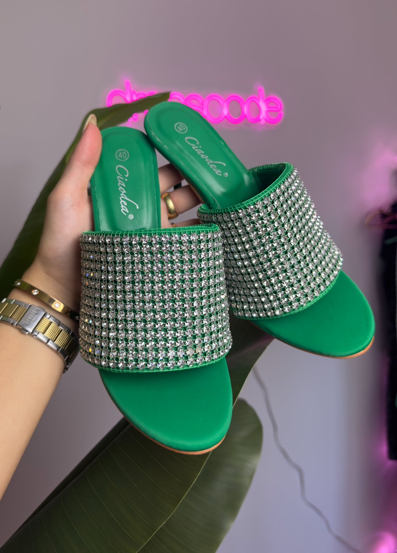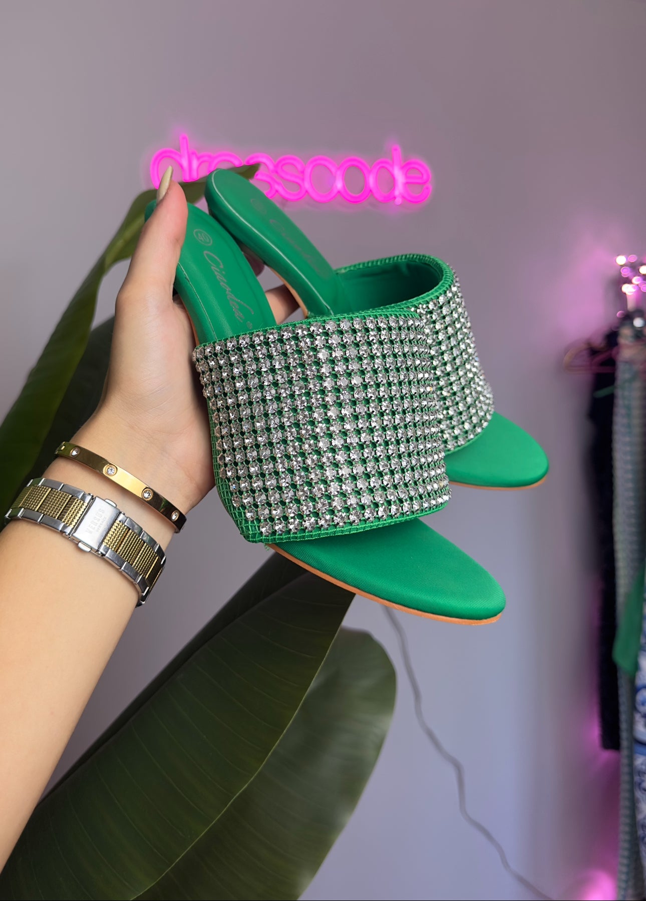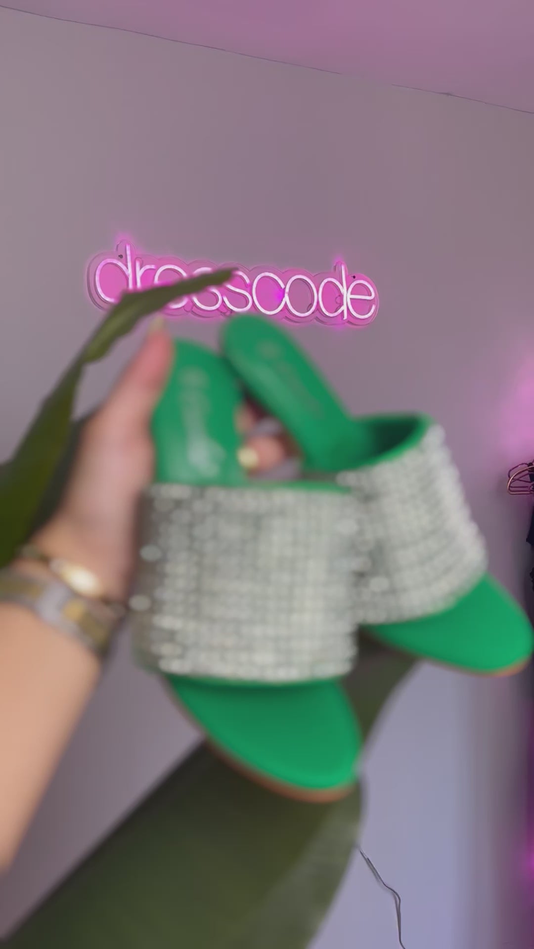 Sandali aperti, con tallone scoperto e fascia a banda larga tappezzata da brillantini sul collo del piede.