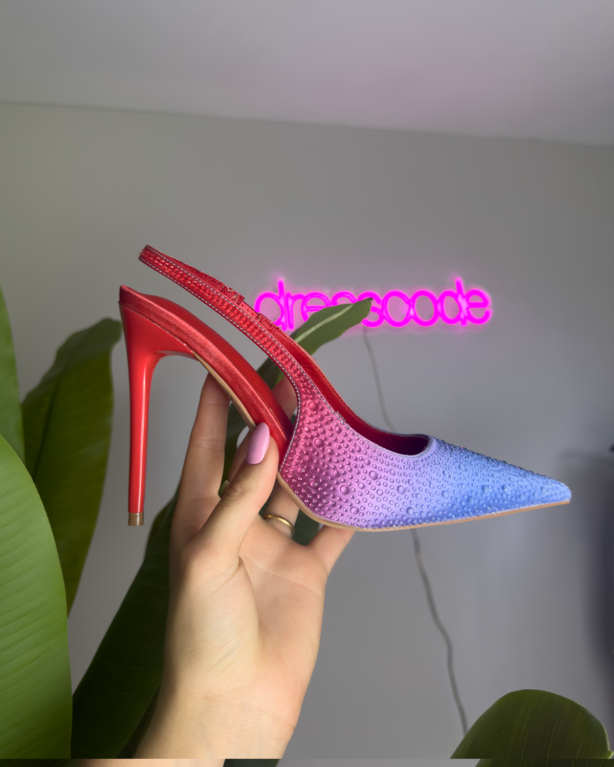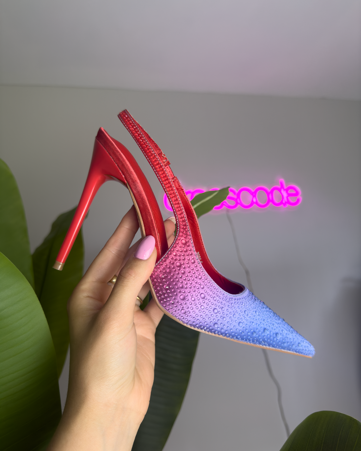 Slingback con tacco a spillo di 10 cm, dégradé lilla/rosso corallo, ricoperto da cristalli trasparenti di diverse misure.