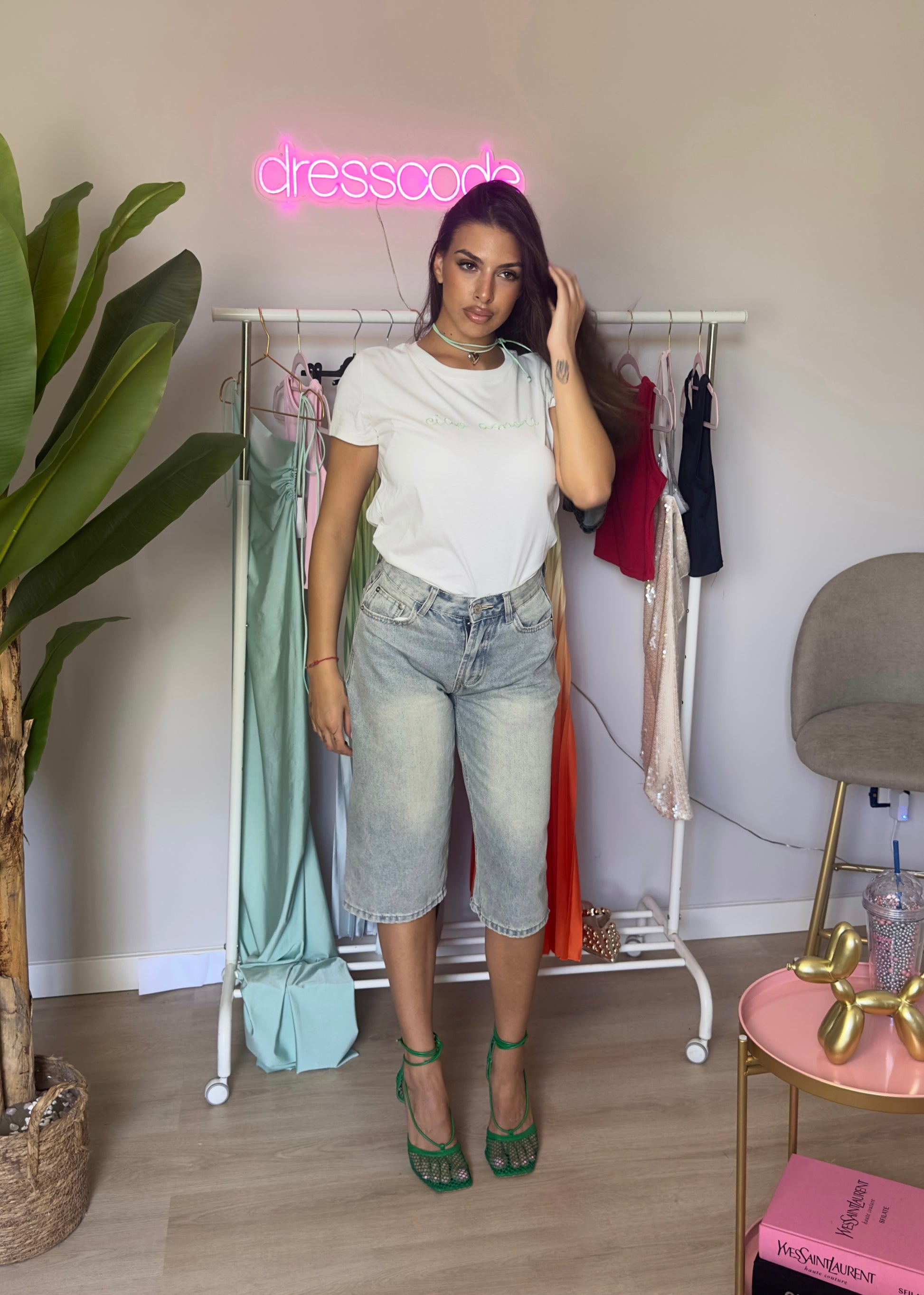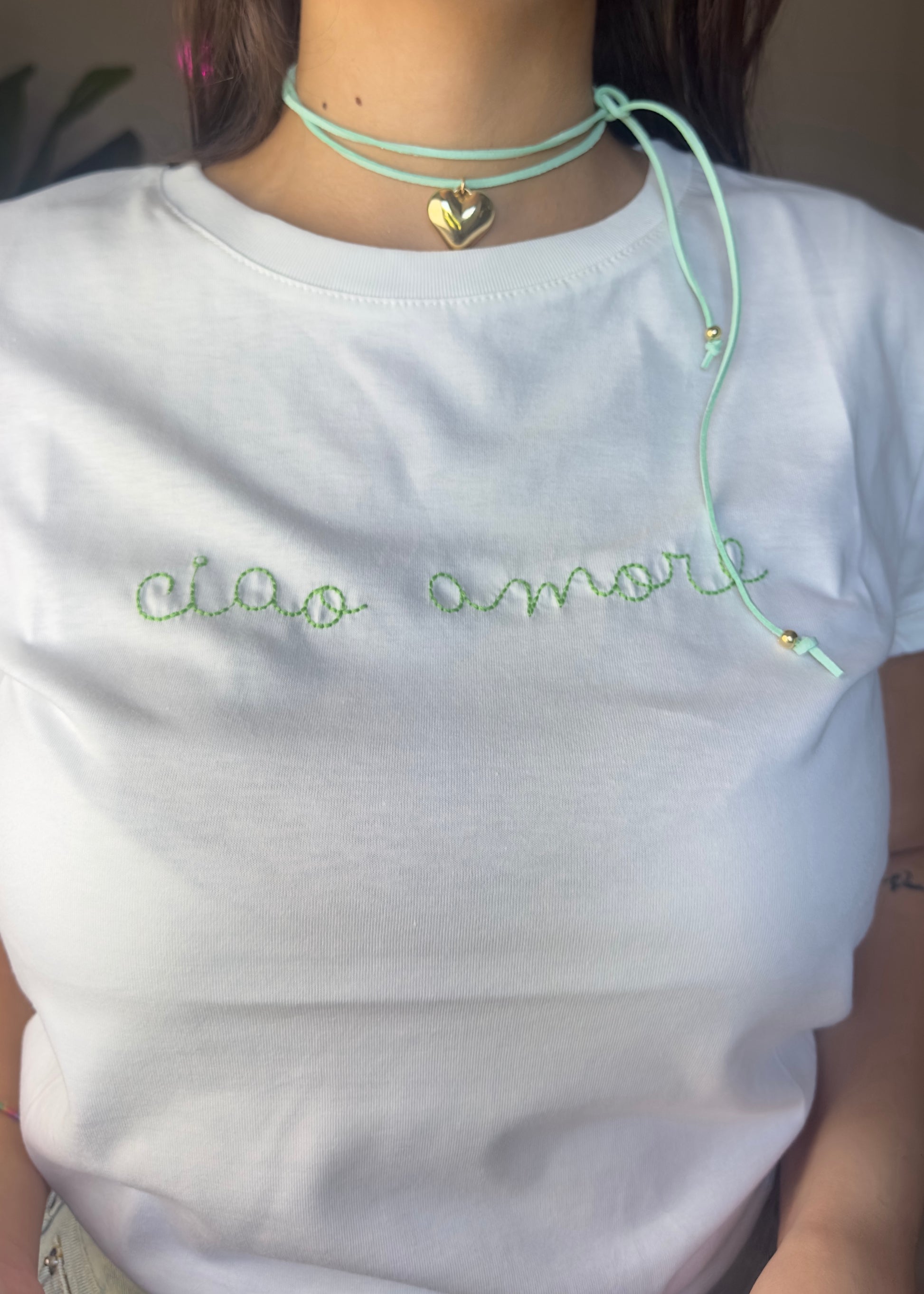 T-shirt lumina in cotone con fondo bianco e scritta ricamata 'ciao amore' in lattementa.